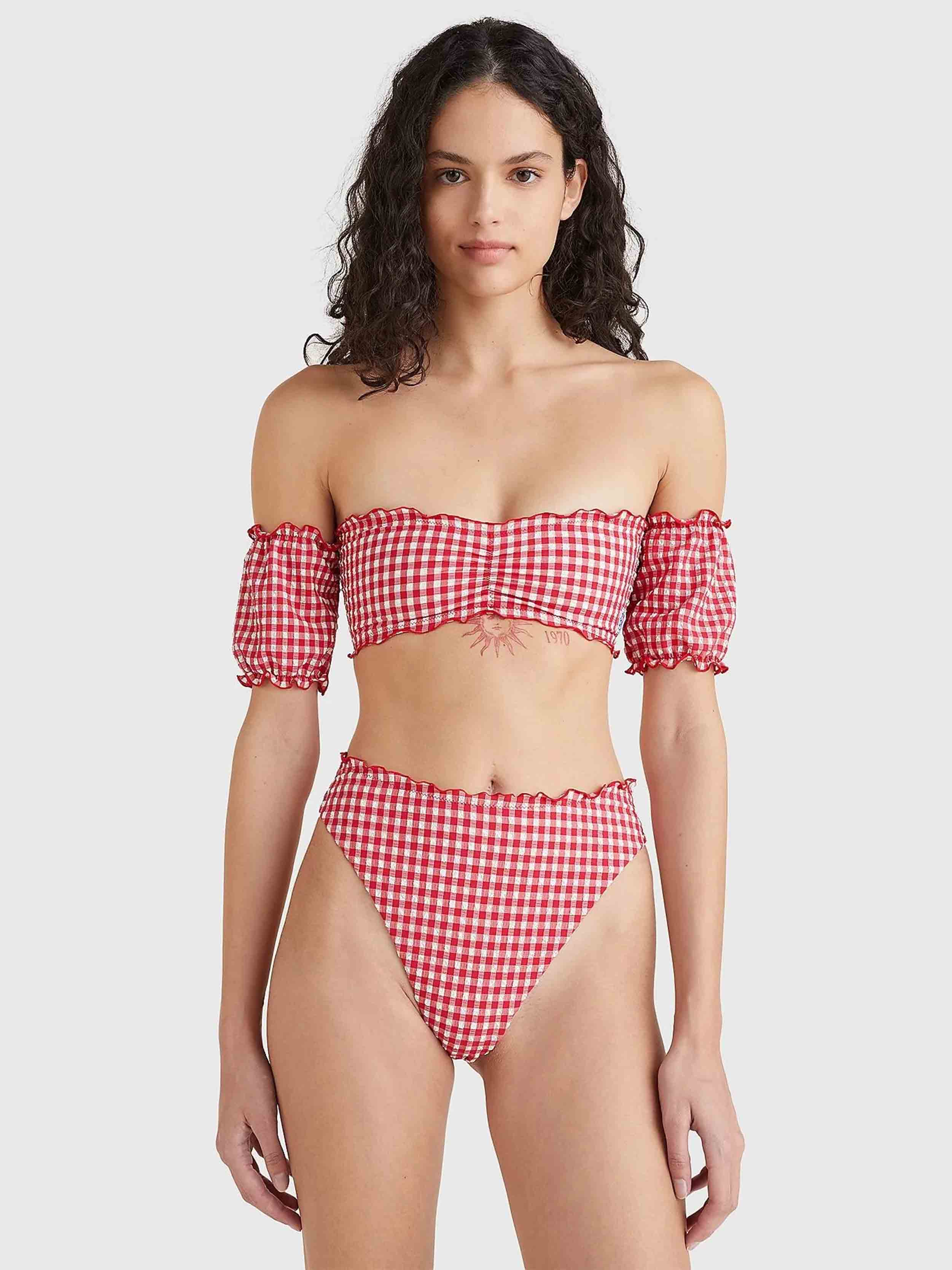 Tommy hilfiger - high leg cheeky bikini , s , primary red and white gingham , style uw0uw03392