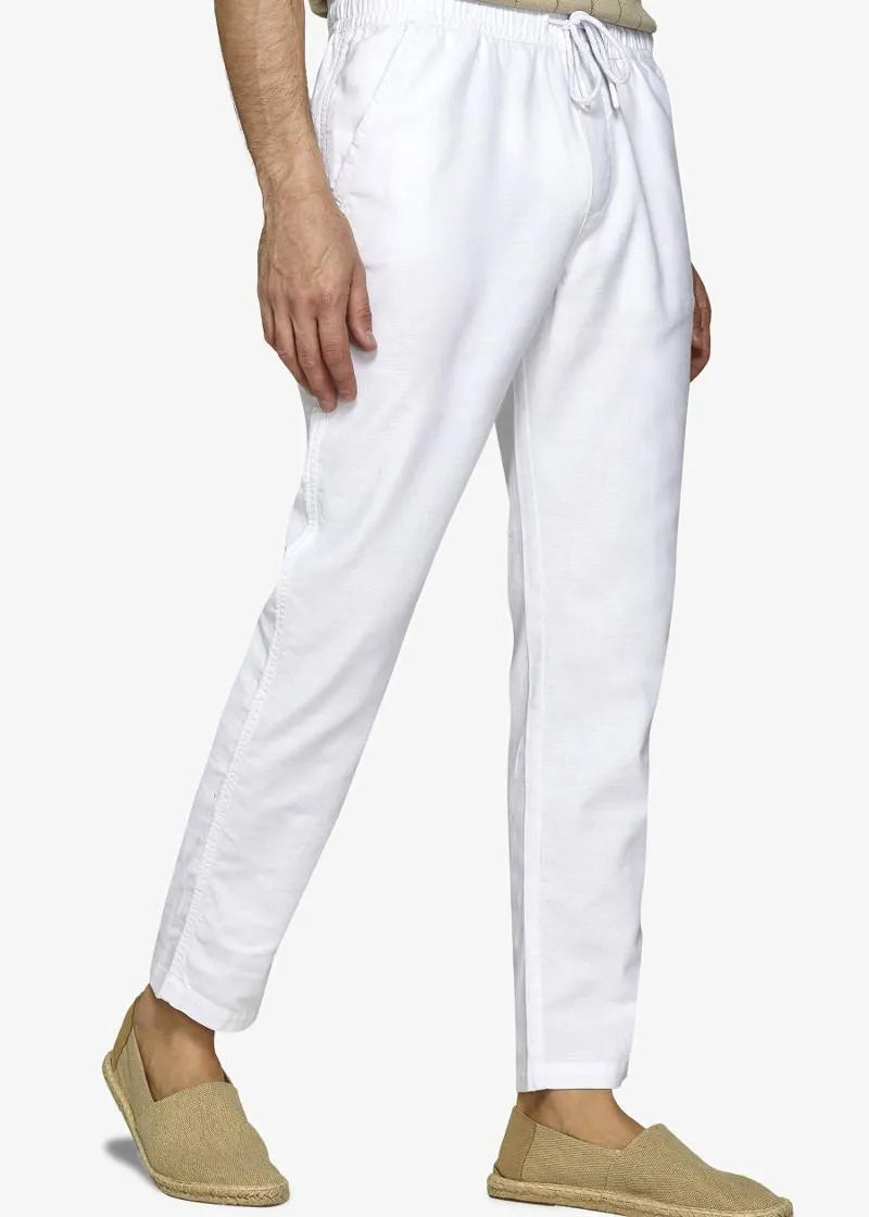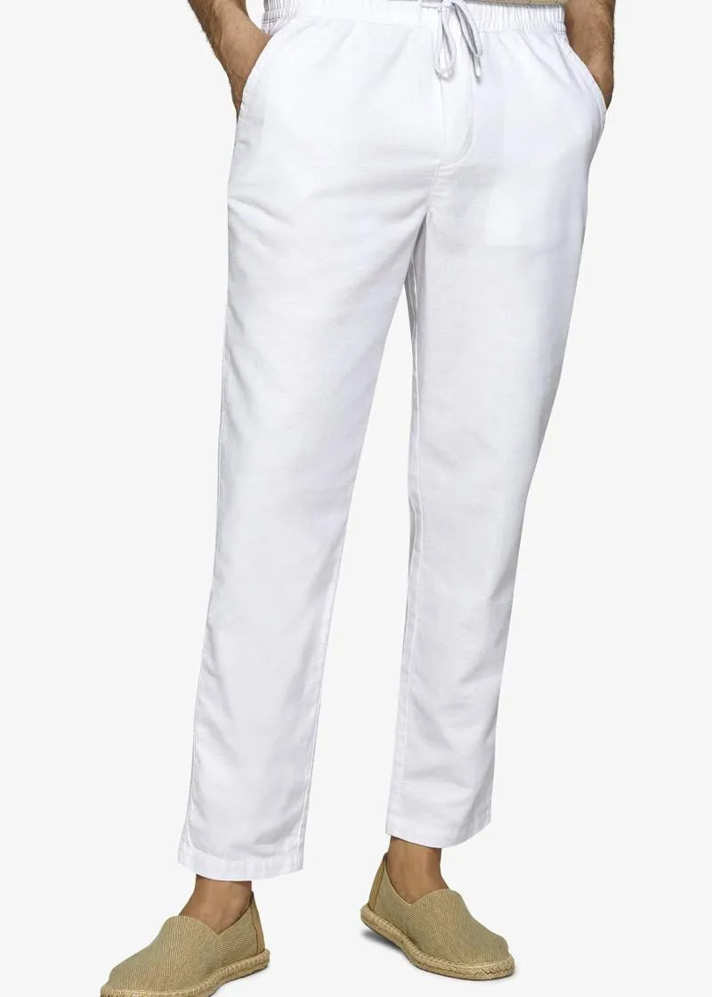 • Woven cotton trousers with drawstring and pleats. Slant pockets.