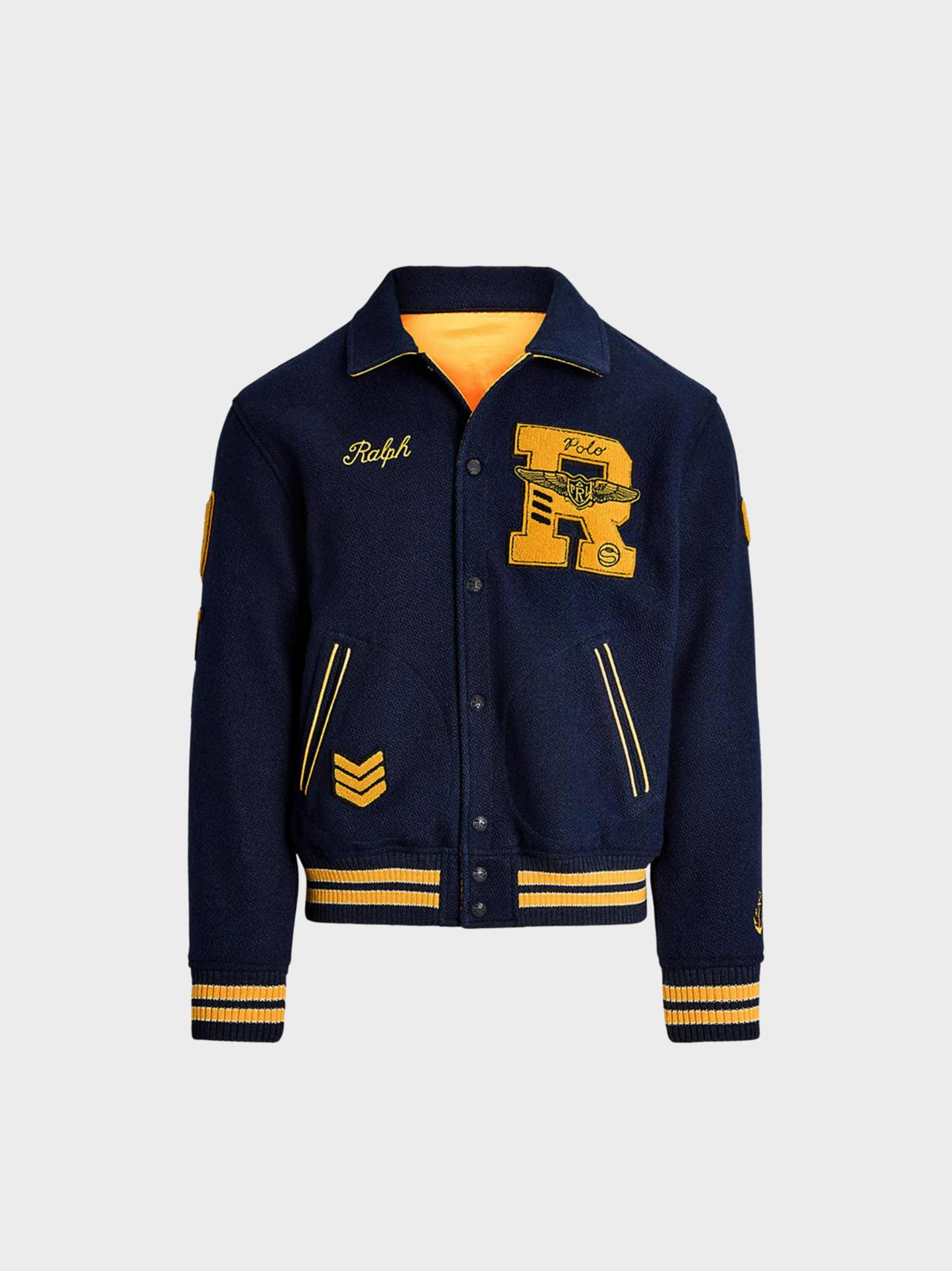• Shell: chenille "R" patch at the left chest. "Ralph" script embroidery at the right chest. Chevrons appliquéd at the right pocket. "67" appliqué at the left sleeve.