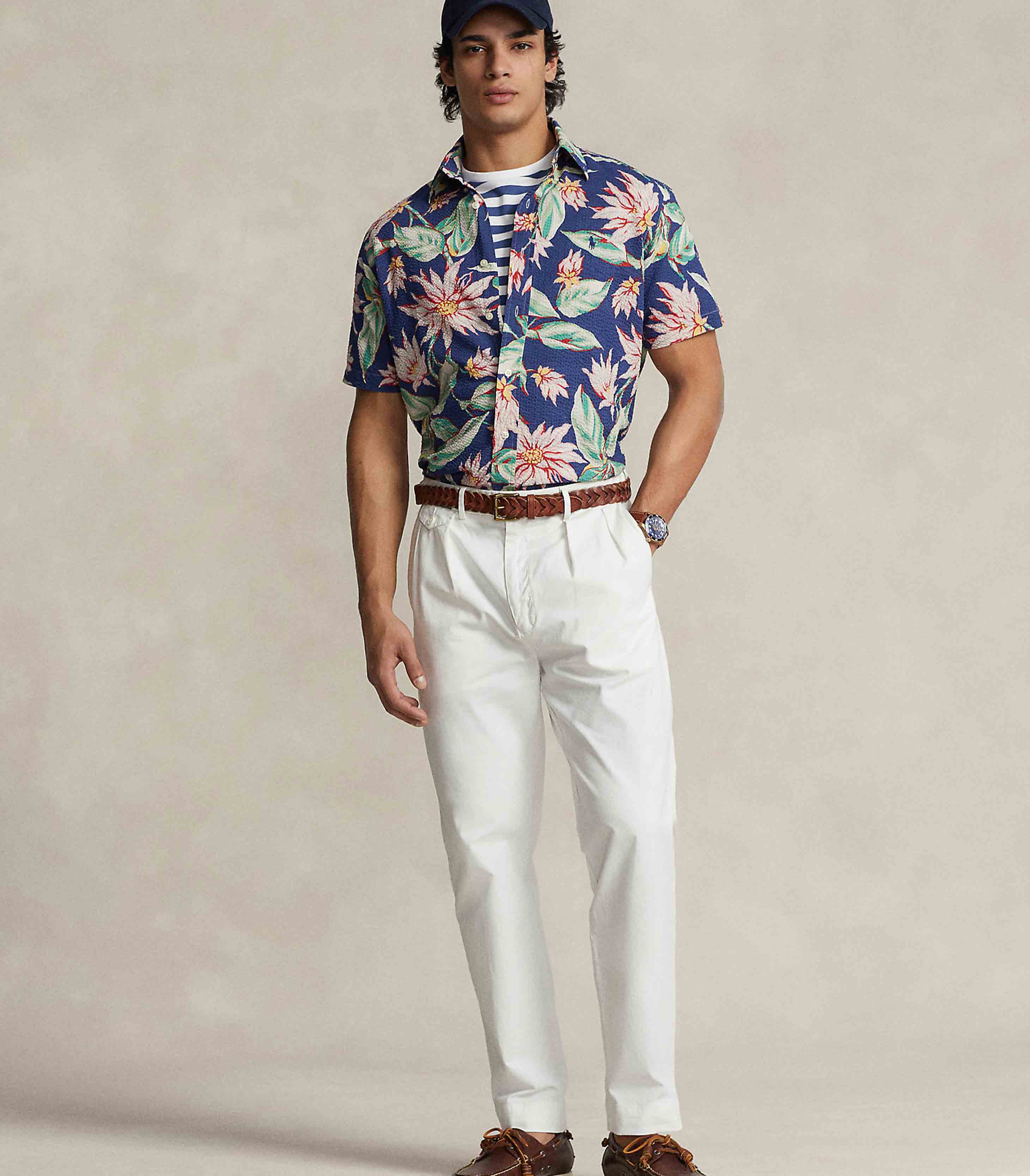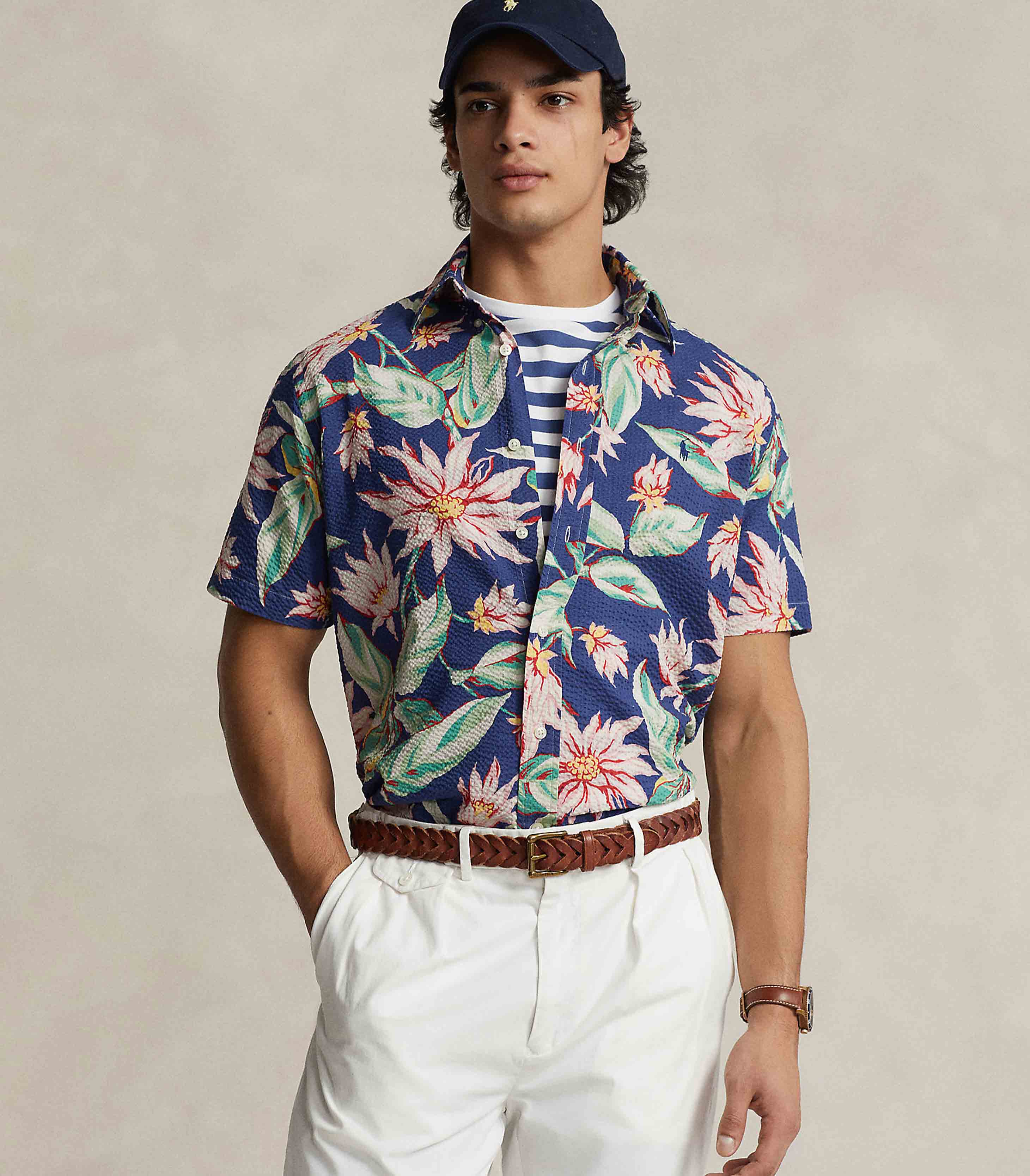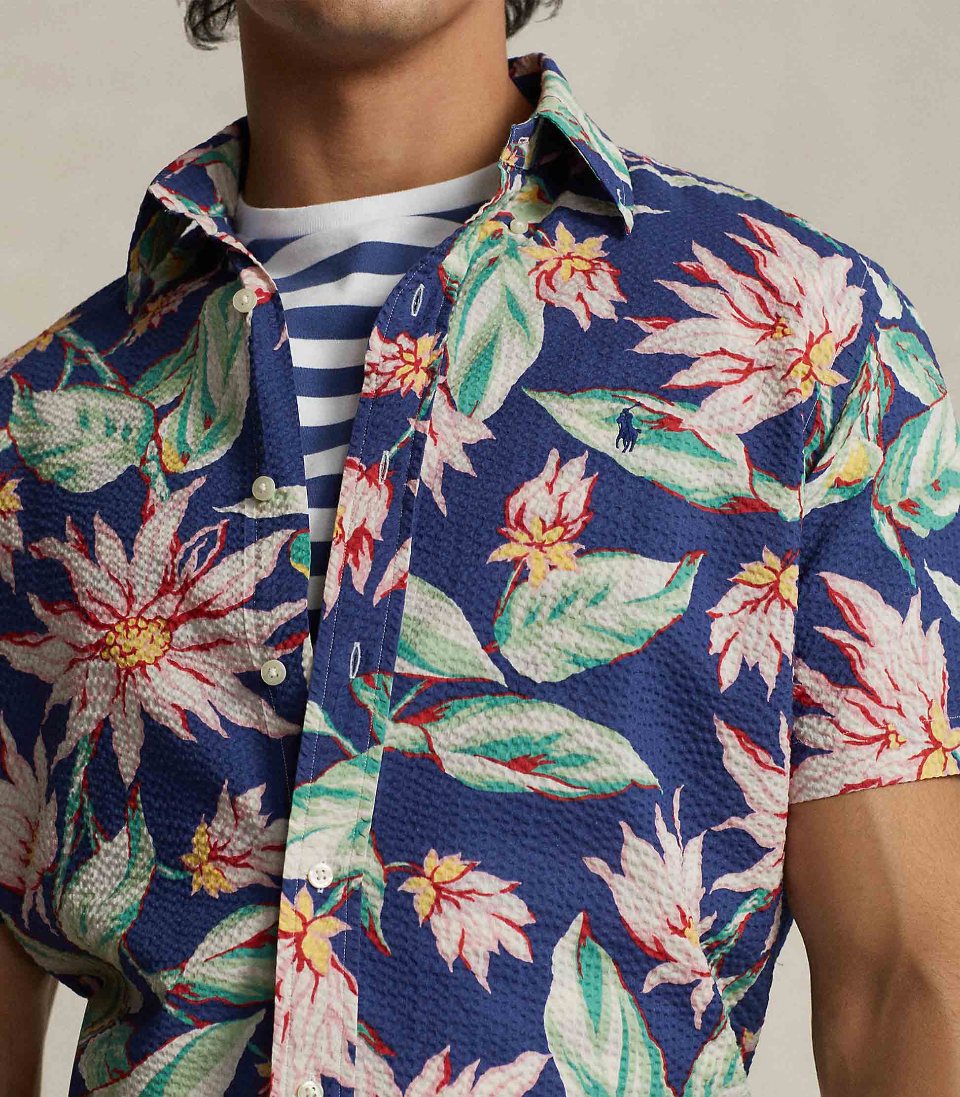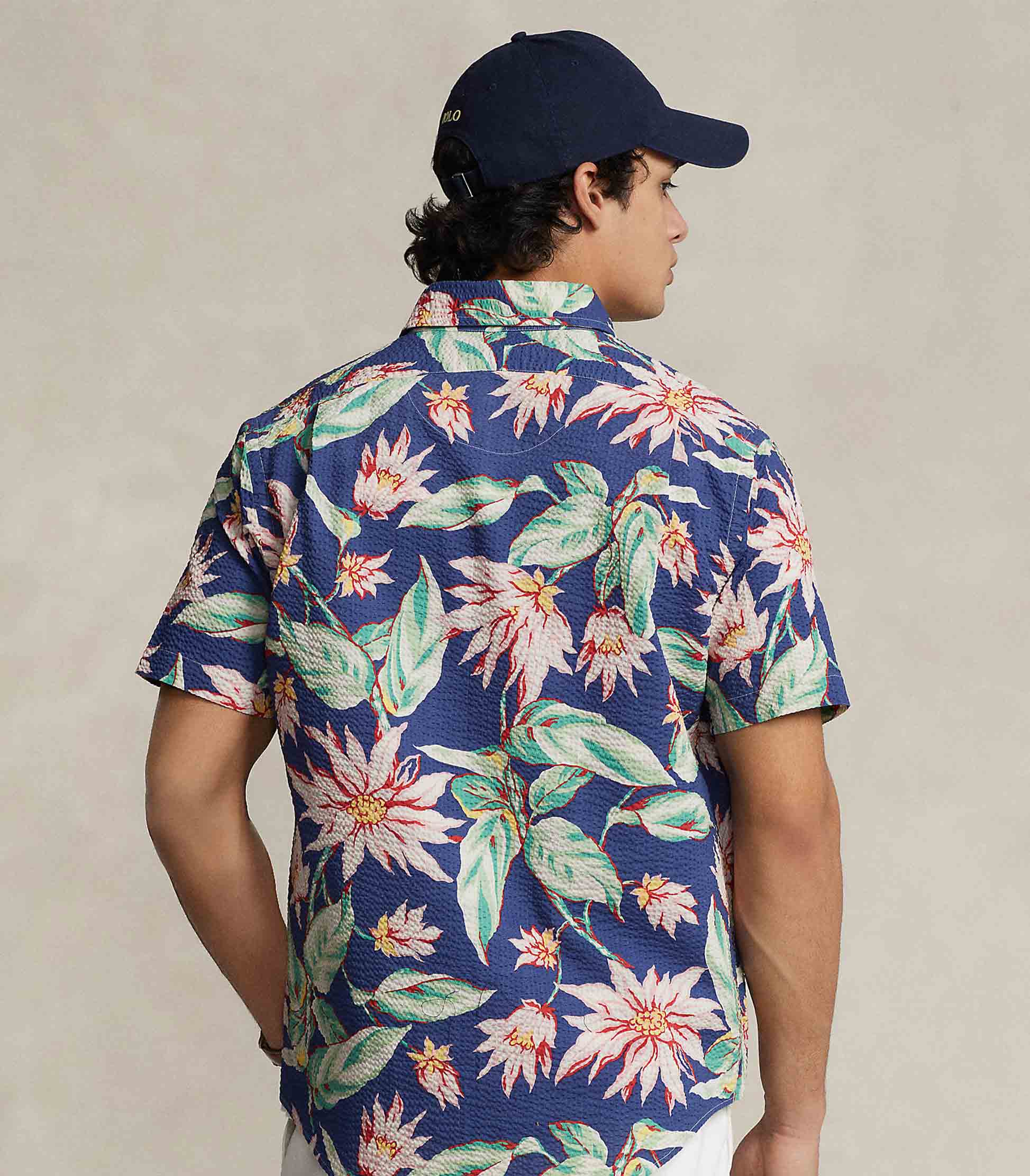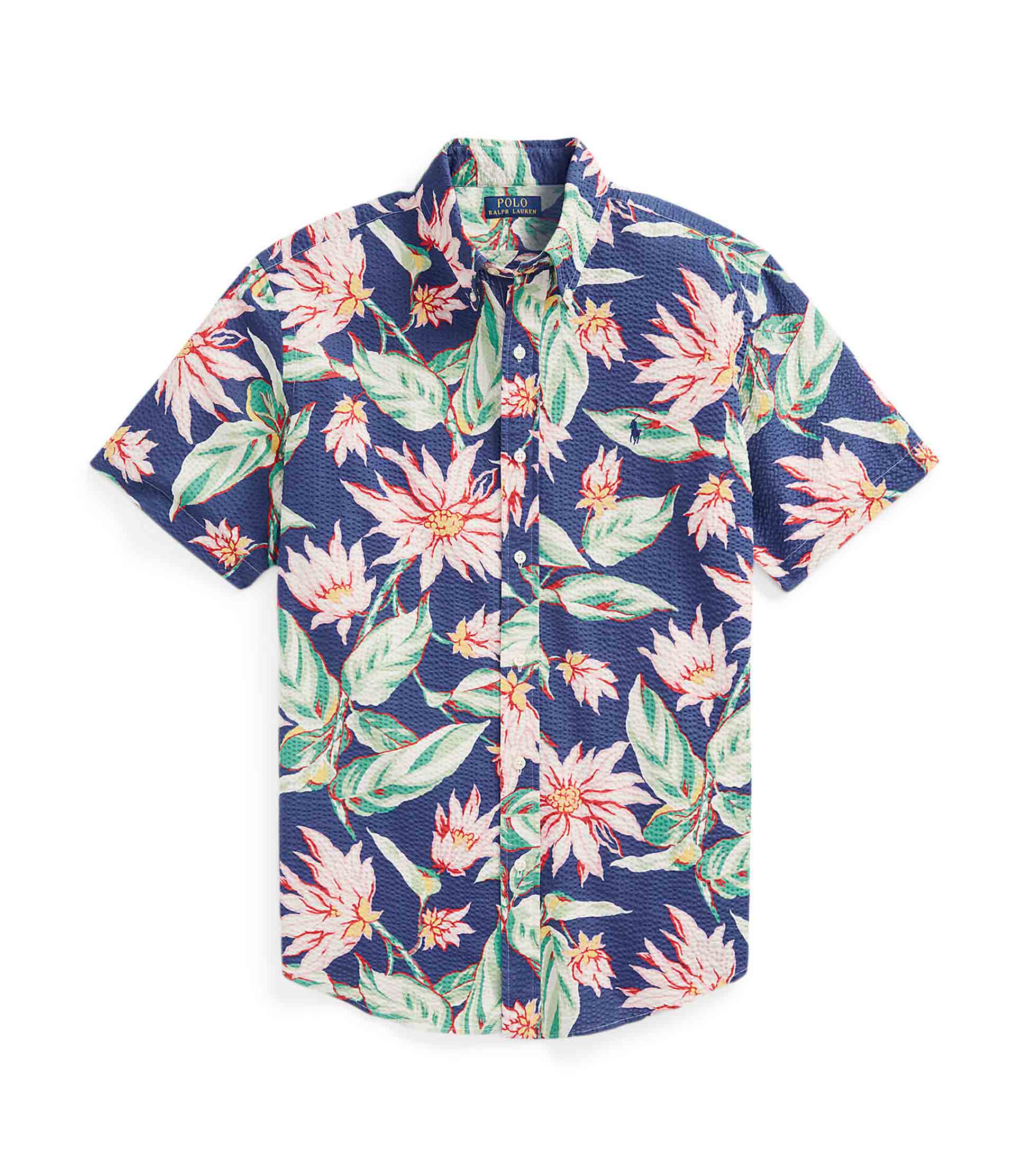 • This short-sleeve shirt is crafted with cotton seersucker that is printed with a painterly floral motif. Known for its signature puckering and texture, the lightweight, breathable fabric is well-suited for warm days.