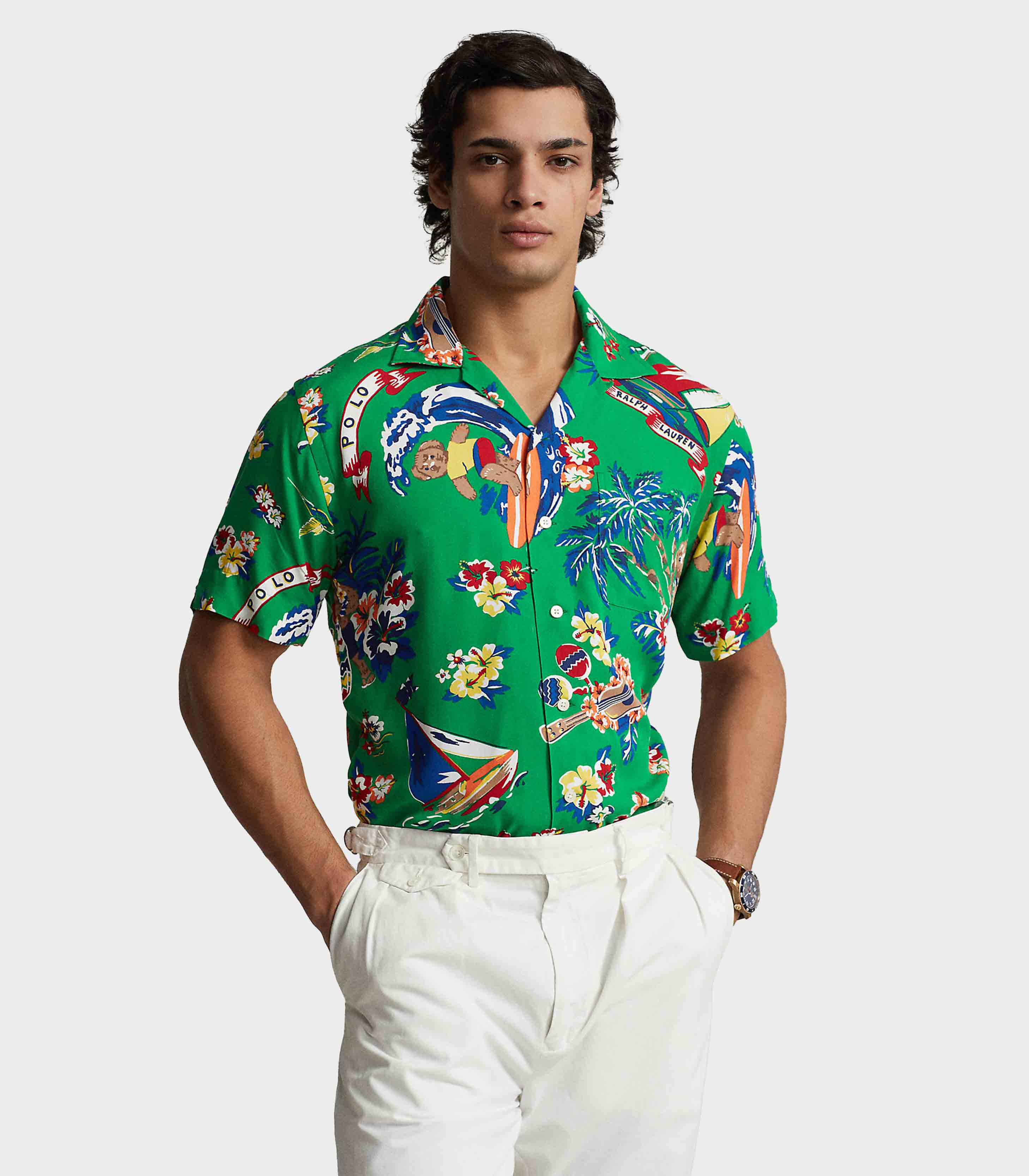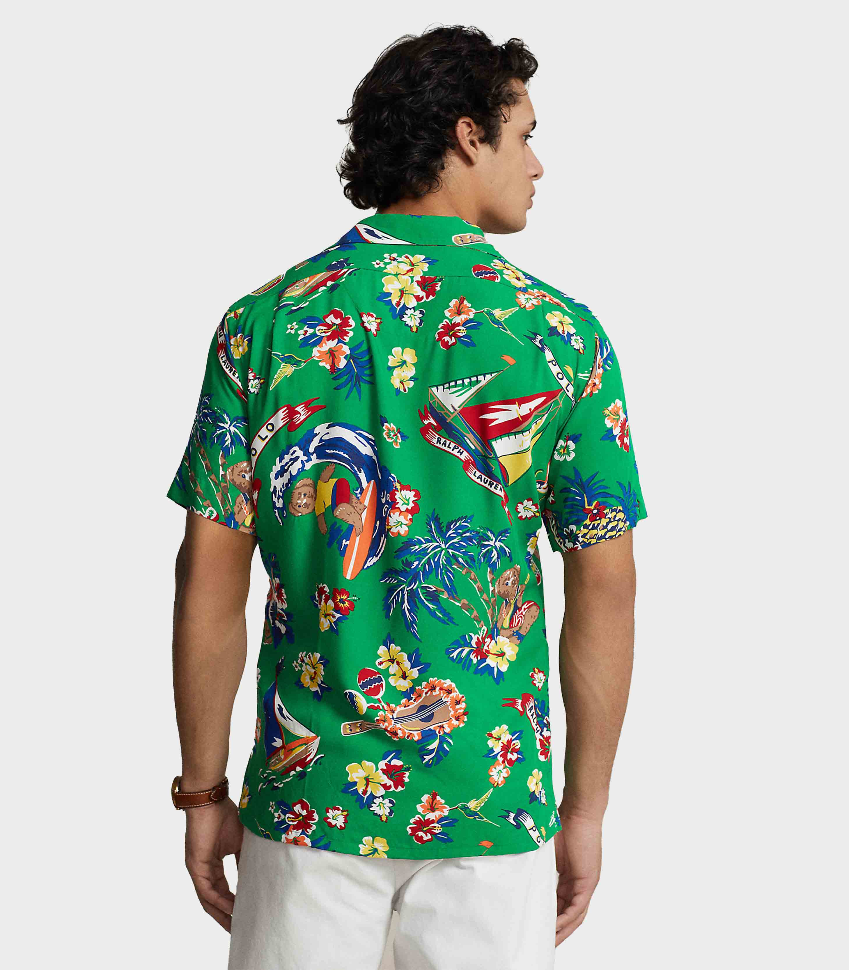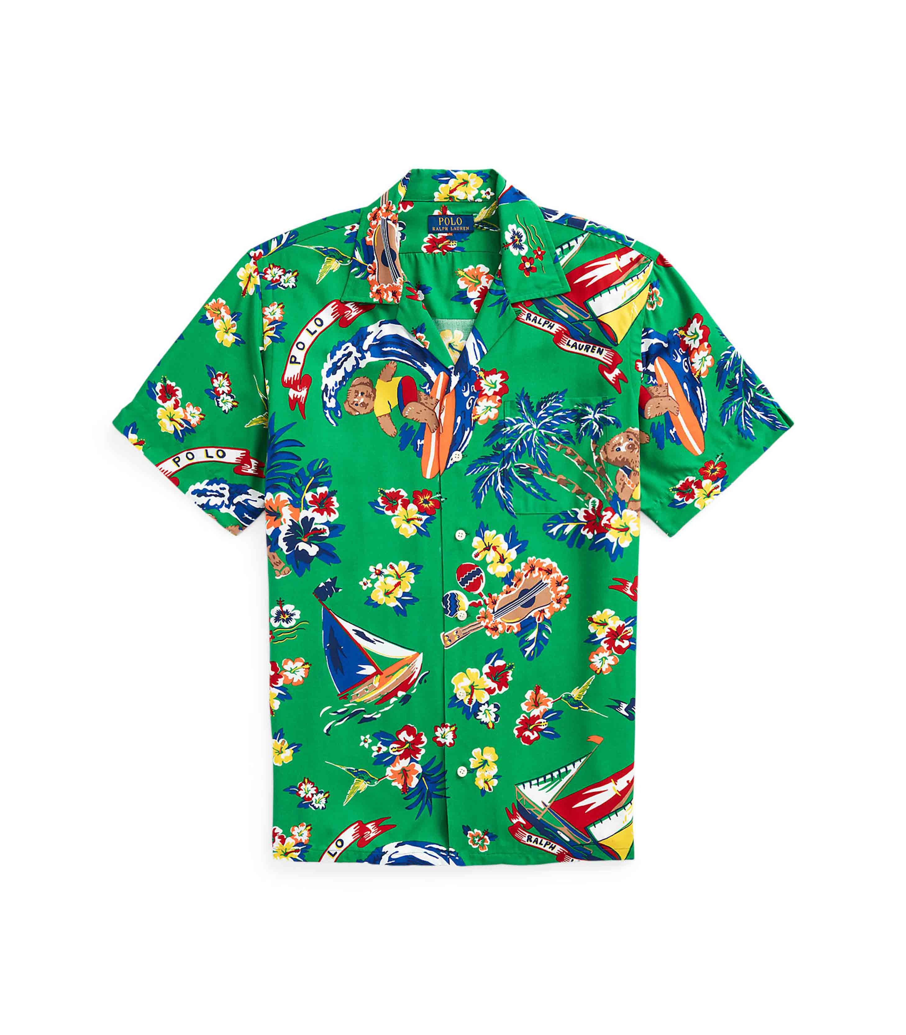 • This lightweight camp shirt is printed with vibrant tropical motifs and features our beloved Polo Bear partaking in Hawaiian-themed festivities.