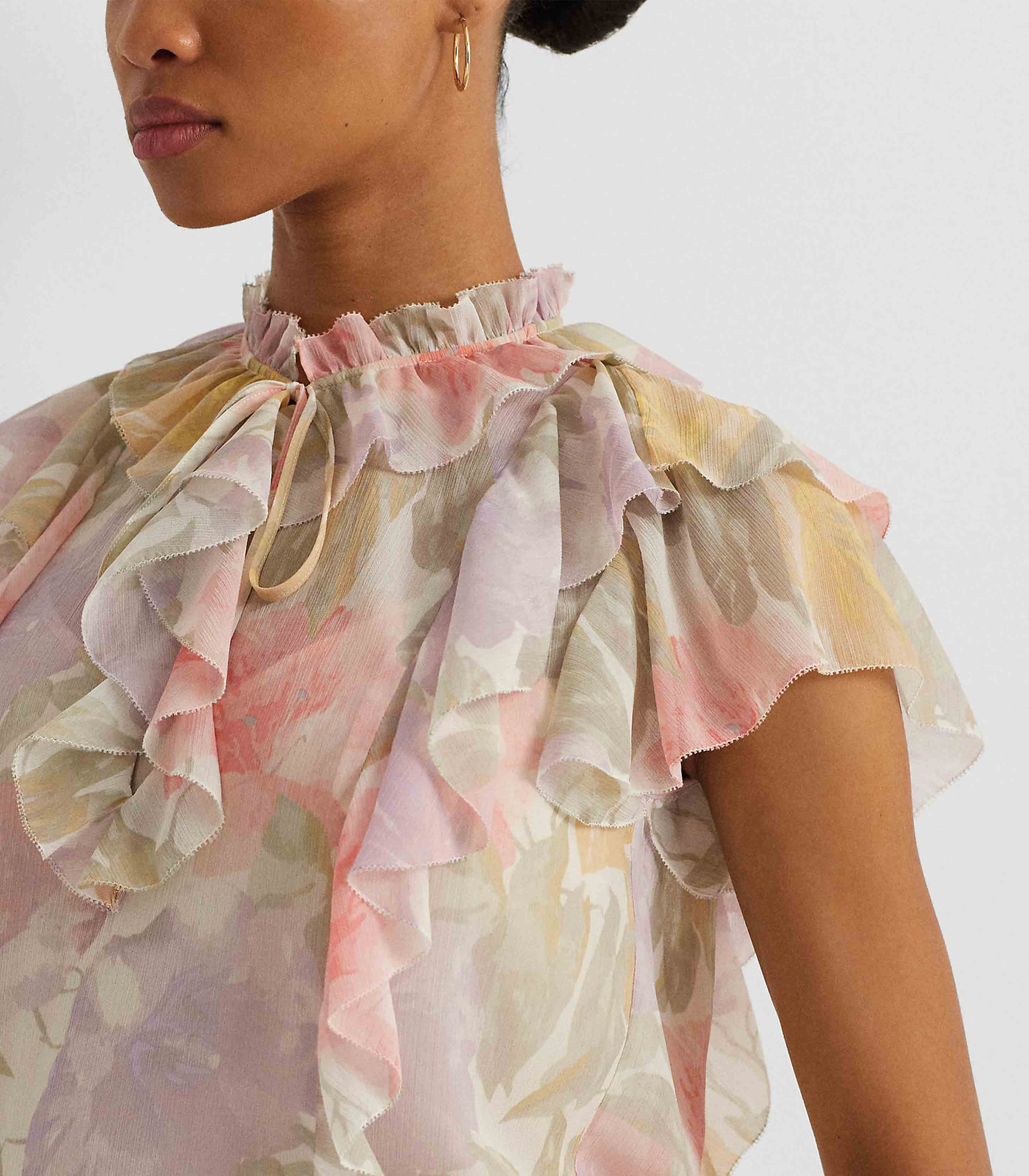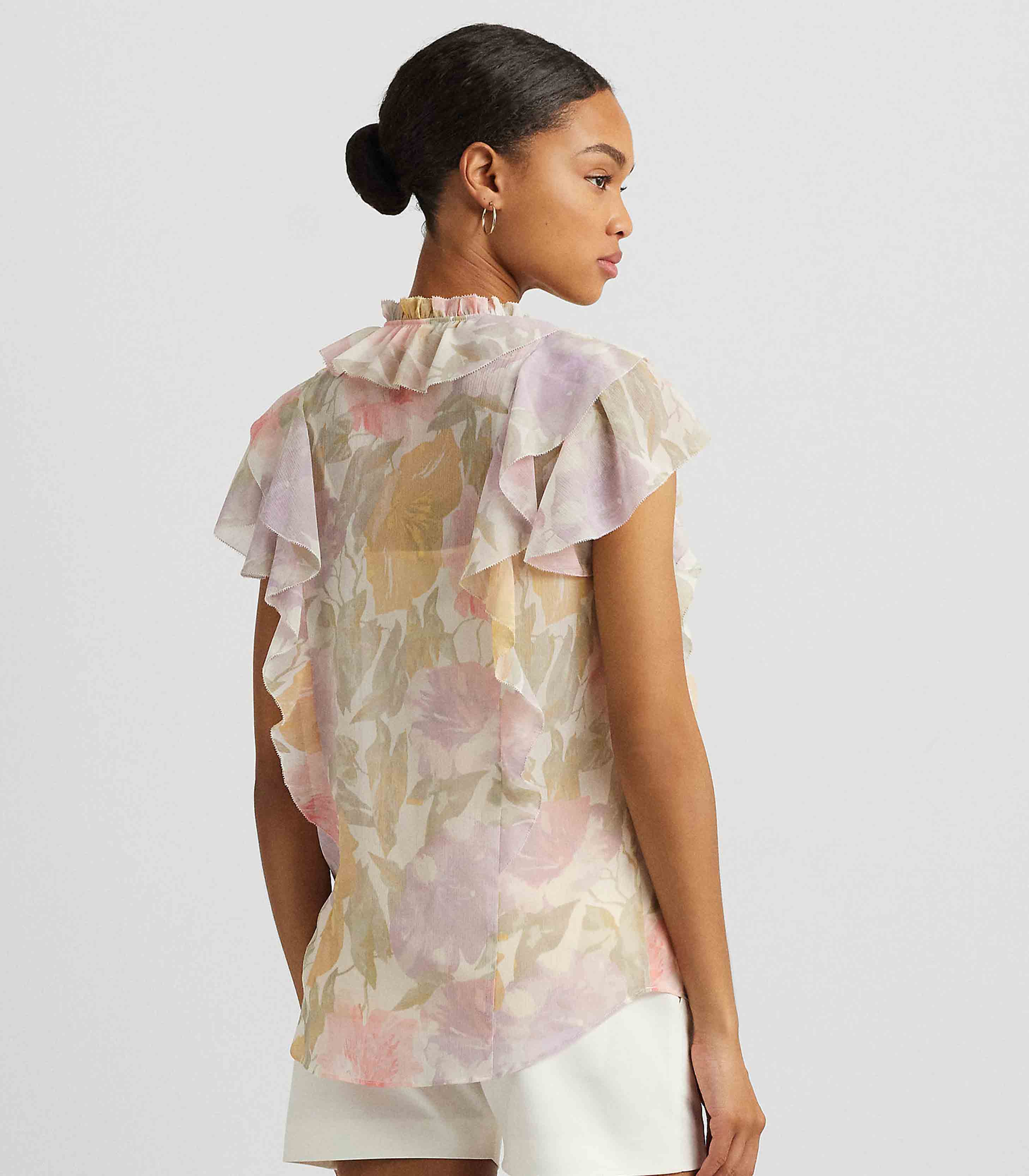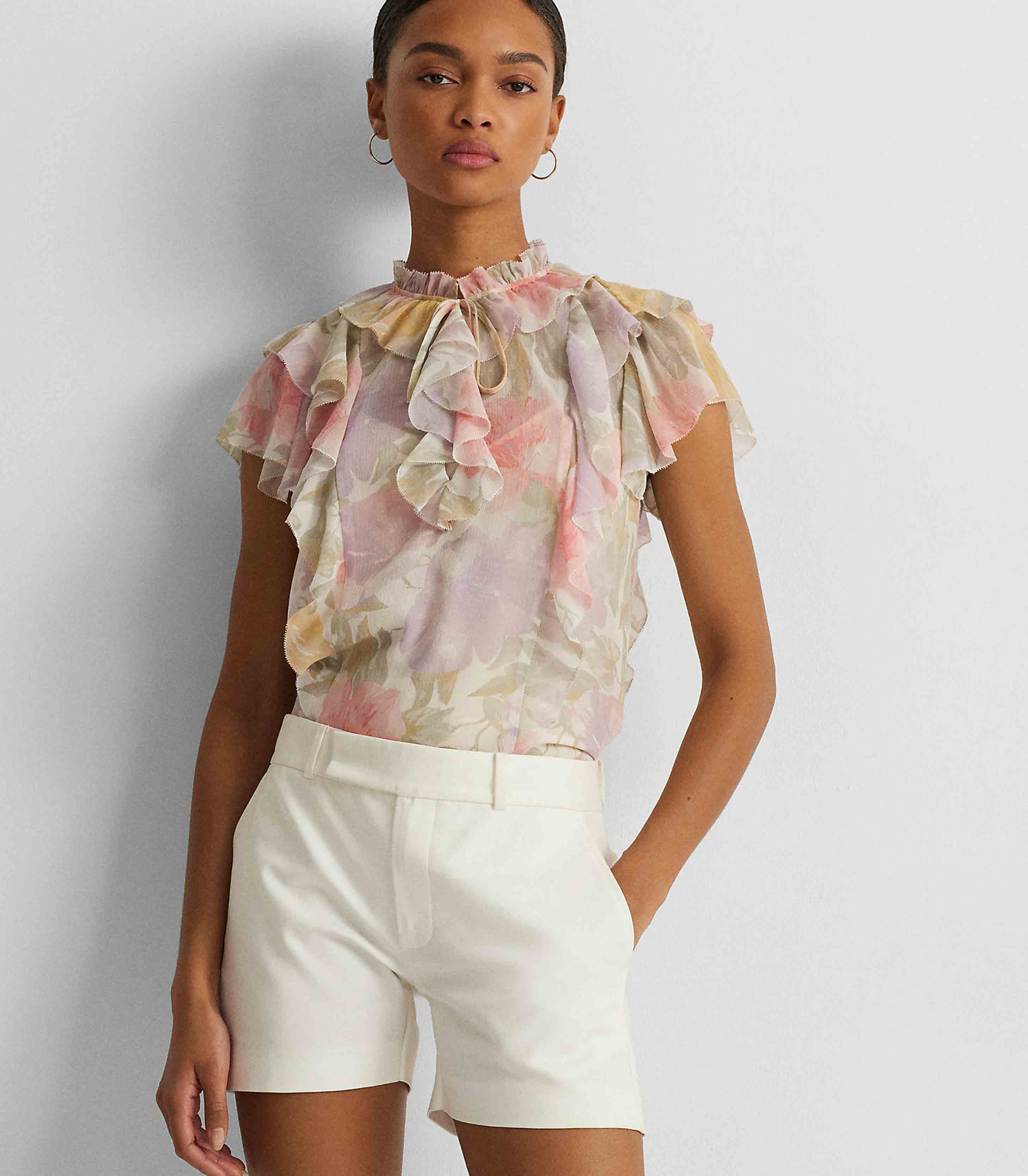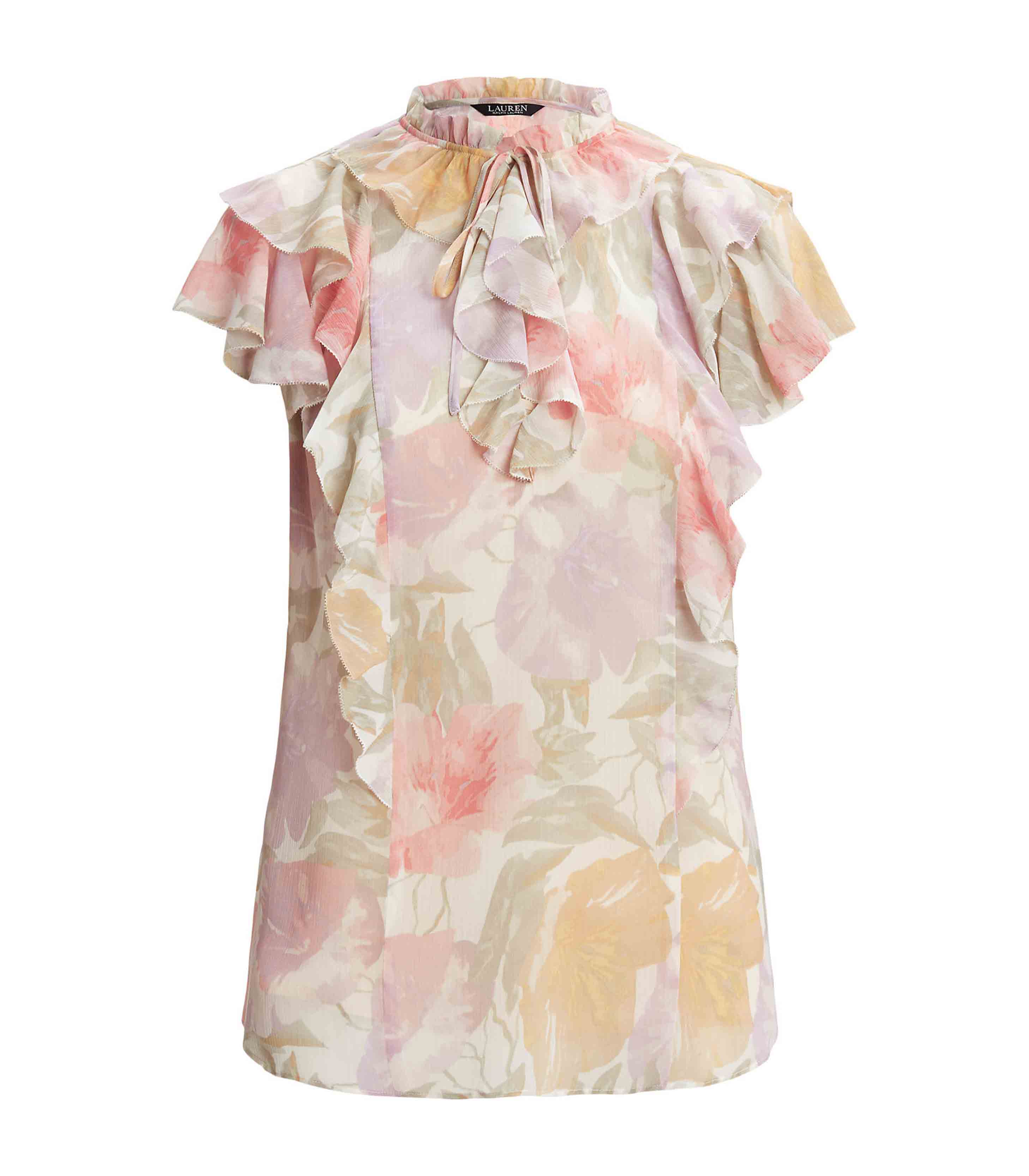 • Crafted with crinkle georgette for an airy look and feel, this blouse is defined by cascading ruffles, flutter sleeves, and a tie-neck accent. The season’s painterly floral motif—which is realized in the season’s pastel color palette—enhances its romantic charm.