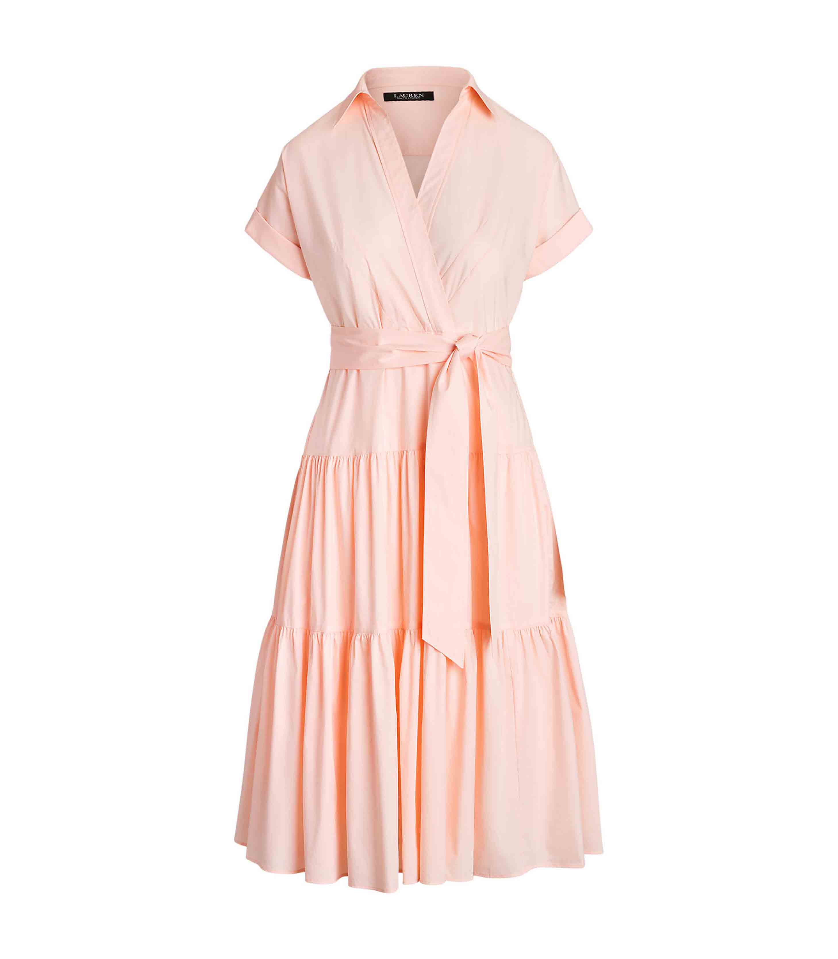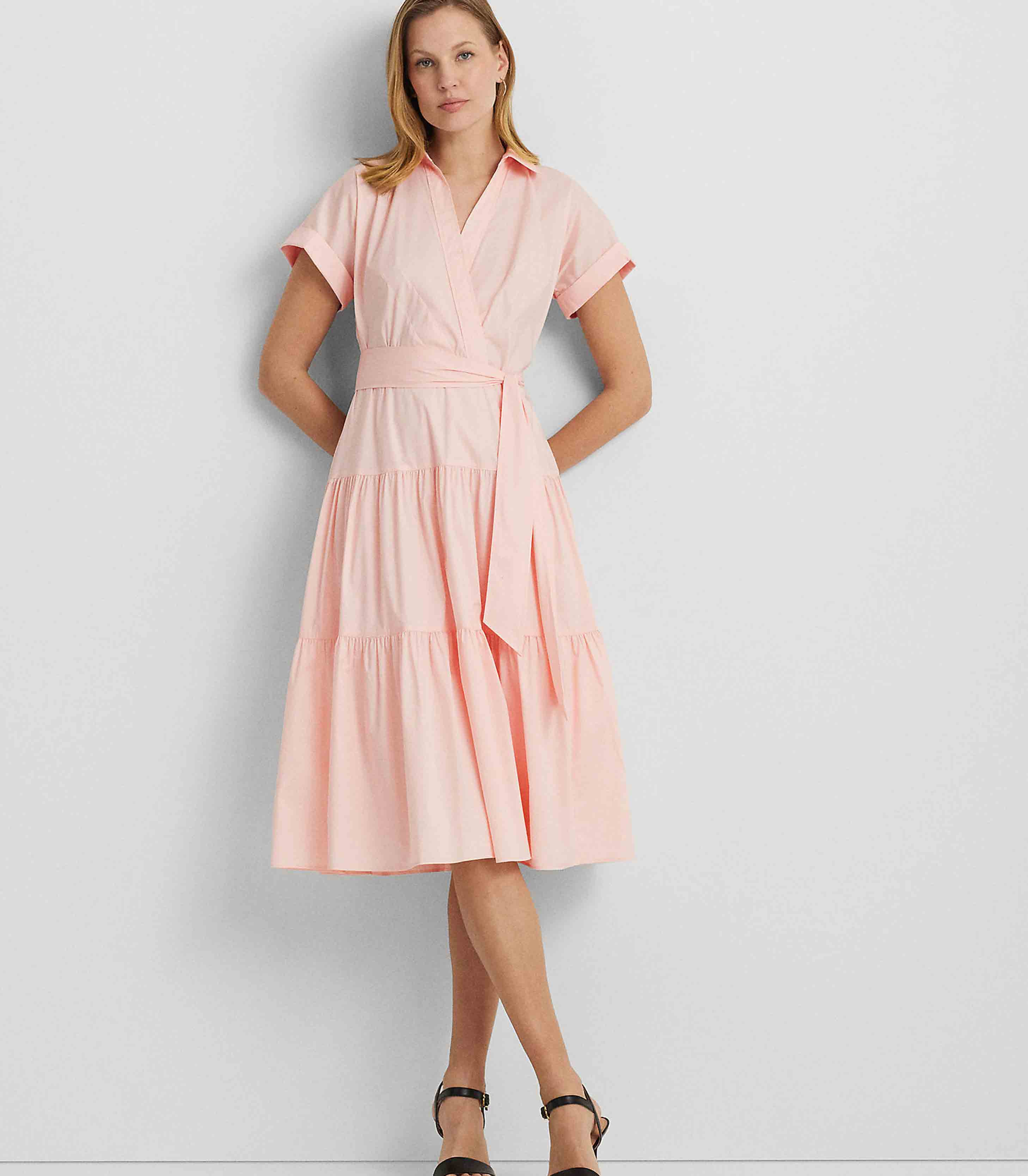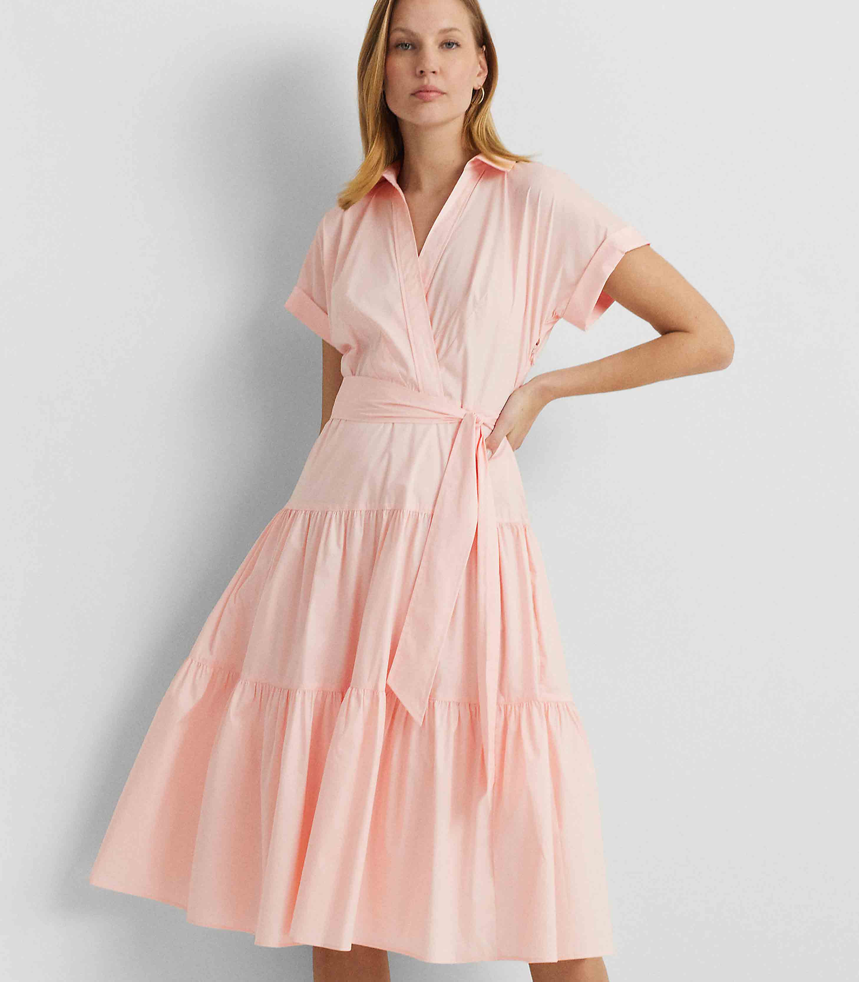 • A belted waist enhances the fit-and-flare silhouette of this surplice midi dress, which is designed with a tiered skirt for graceful movement. Rolled sleeves and dropped shoulders lend to its effortless appeal, while a lightweight stretch-cotton–blend fabrication affords a silky hand.