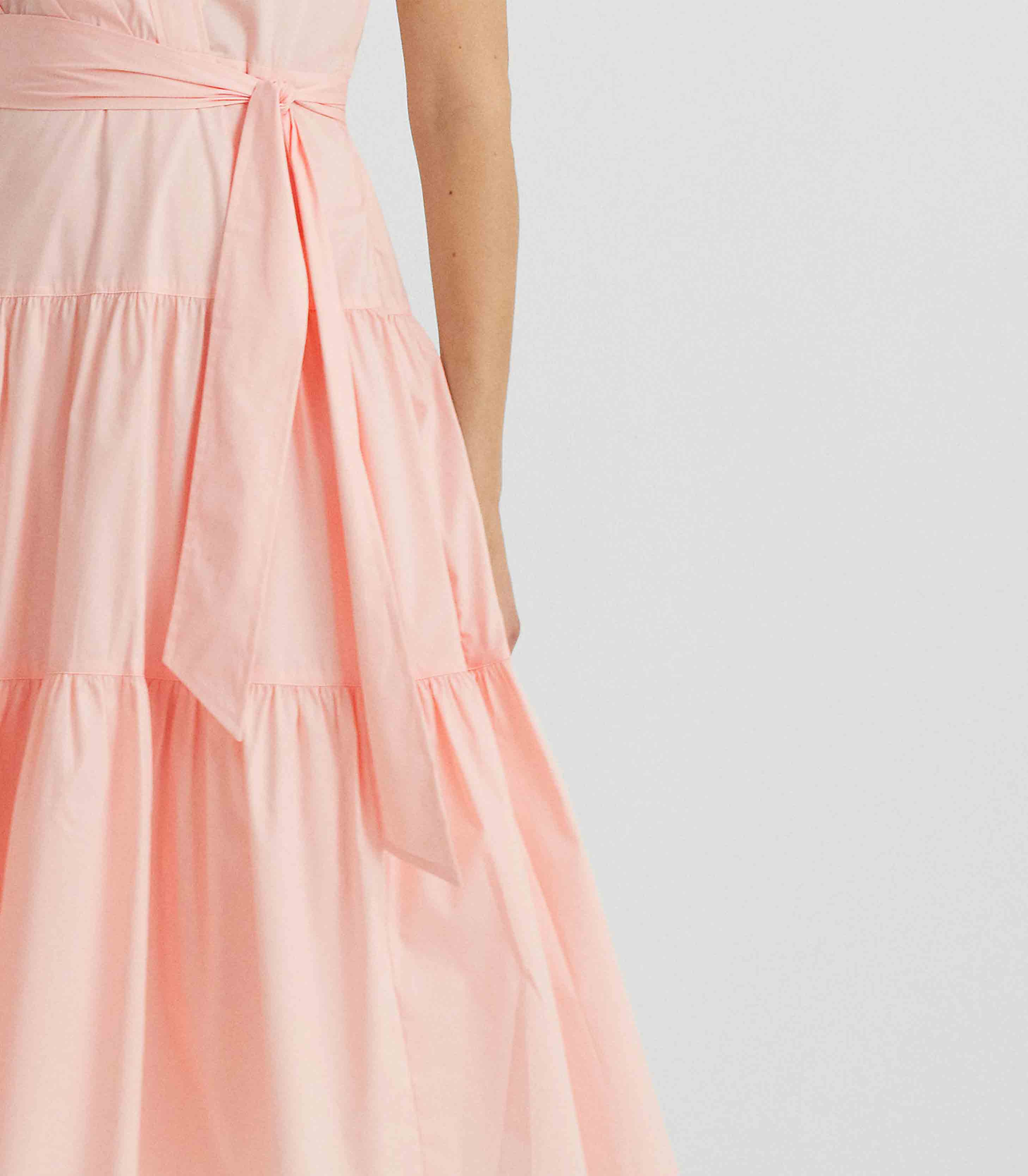 • Short sleeves with rolled cuffs. Dropped shoulders. Pleating at the front bodice. Threaded belt loops. Comes with a removable self-belt. Tiered skirt. Shirring into the tier seams. Back yoke. Lined at the skirt with cotton voile.
