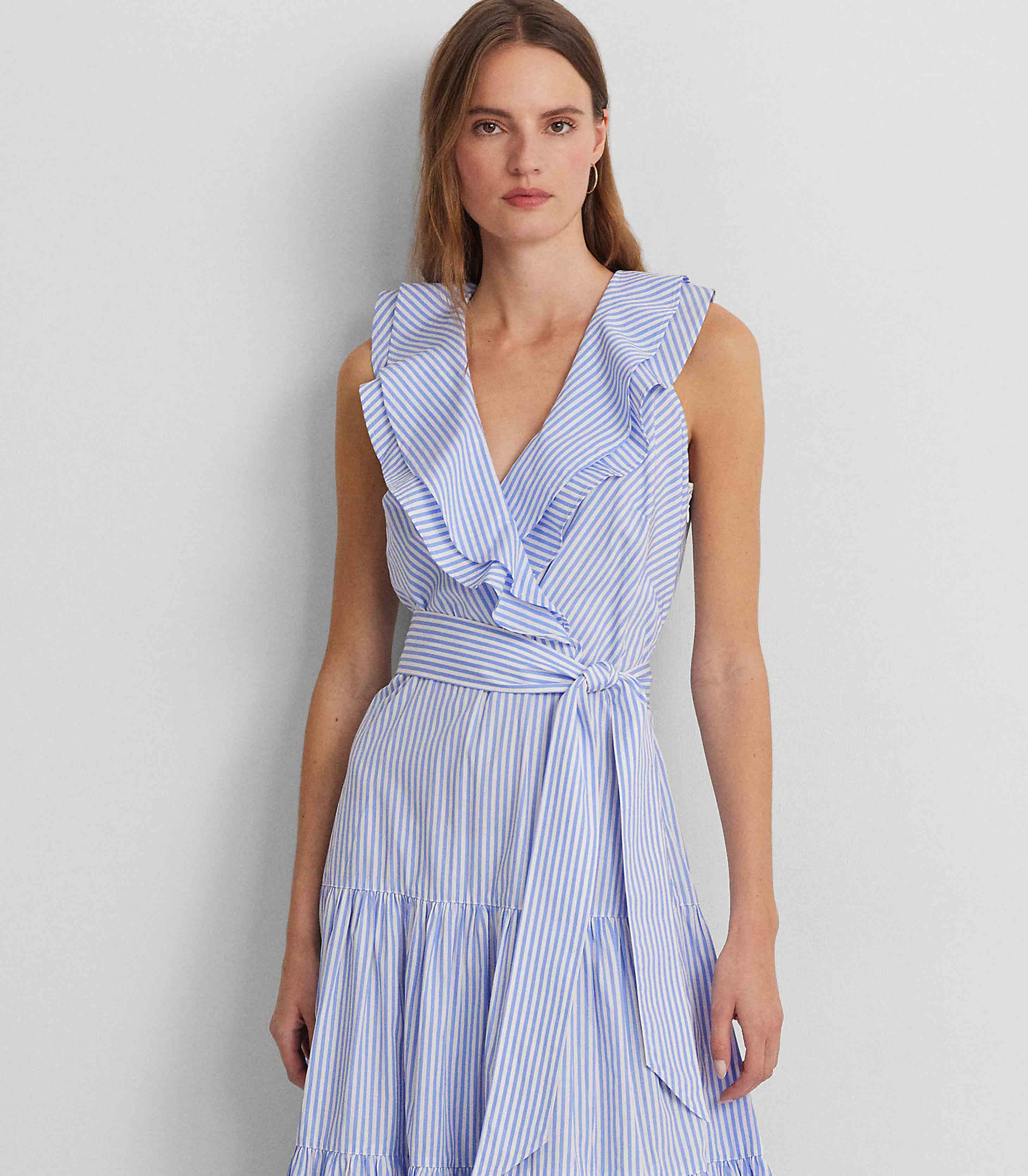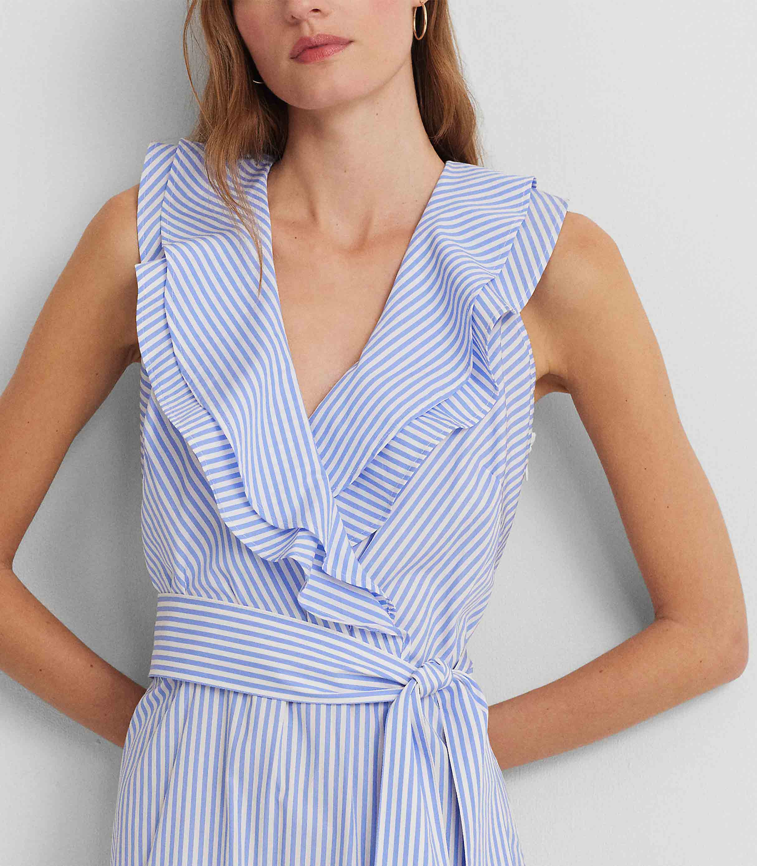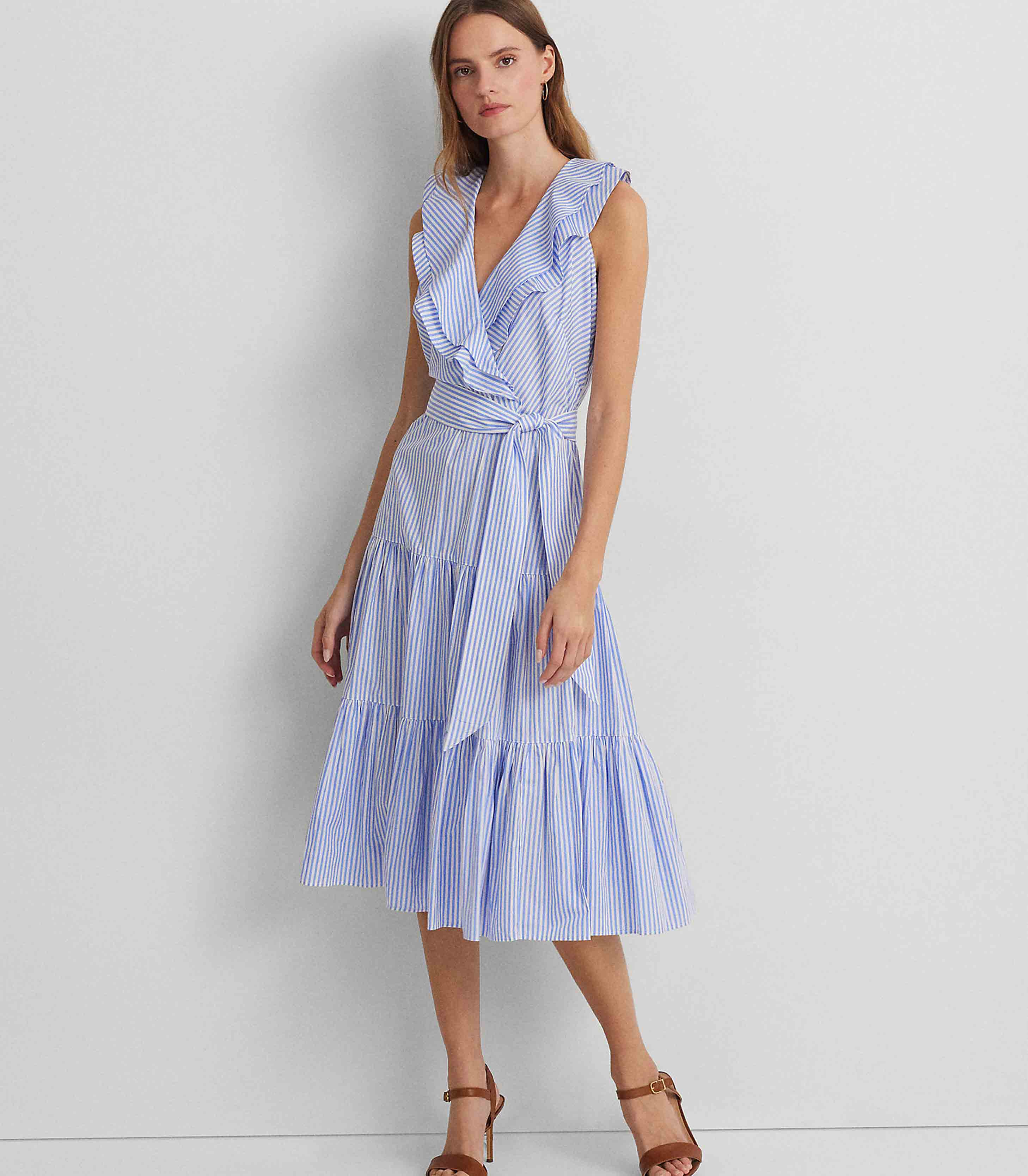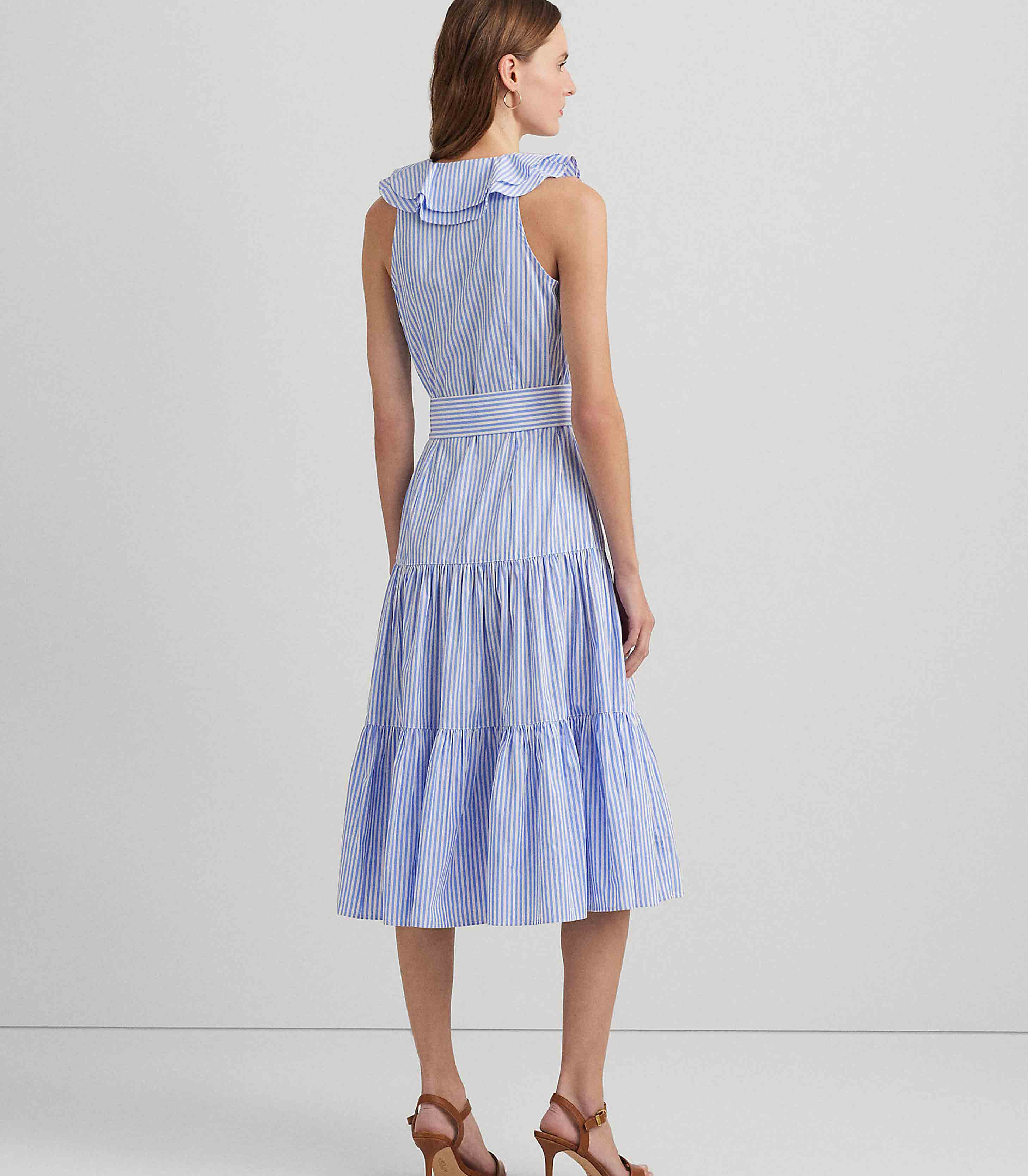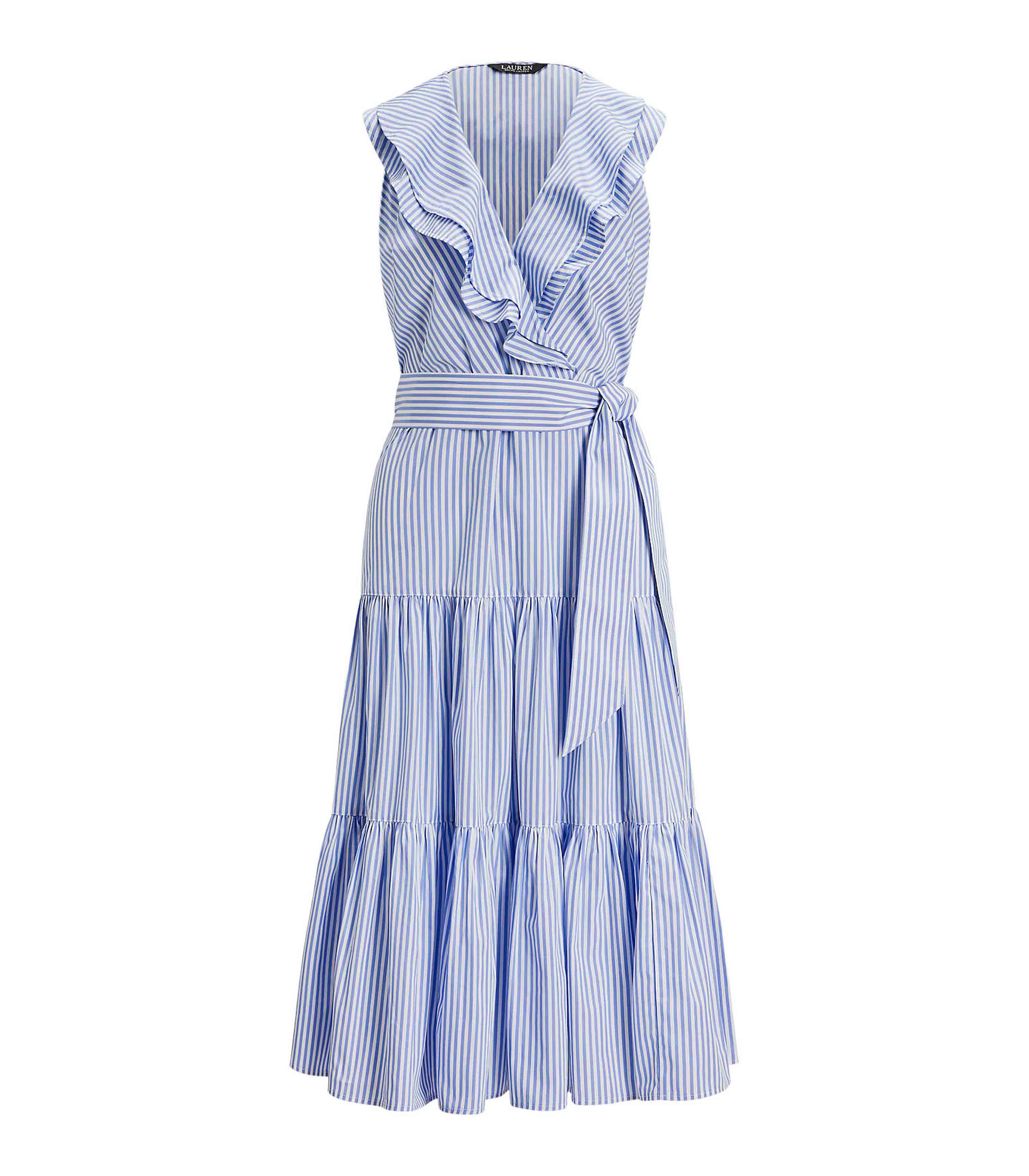 • Punctuated by slender yarn-dyed stripes and crafted with airy cotton broadcloth, this sleeveless dress is a must-have style for the warm-weather season. Ruffle trim, a belted waist, and a fluid tiered skirt lend to its charming character.