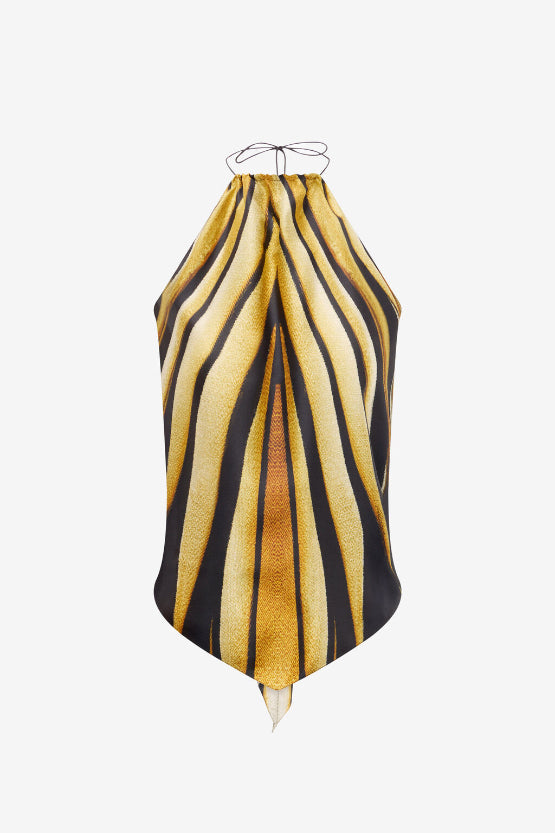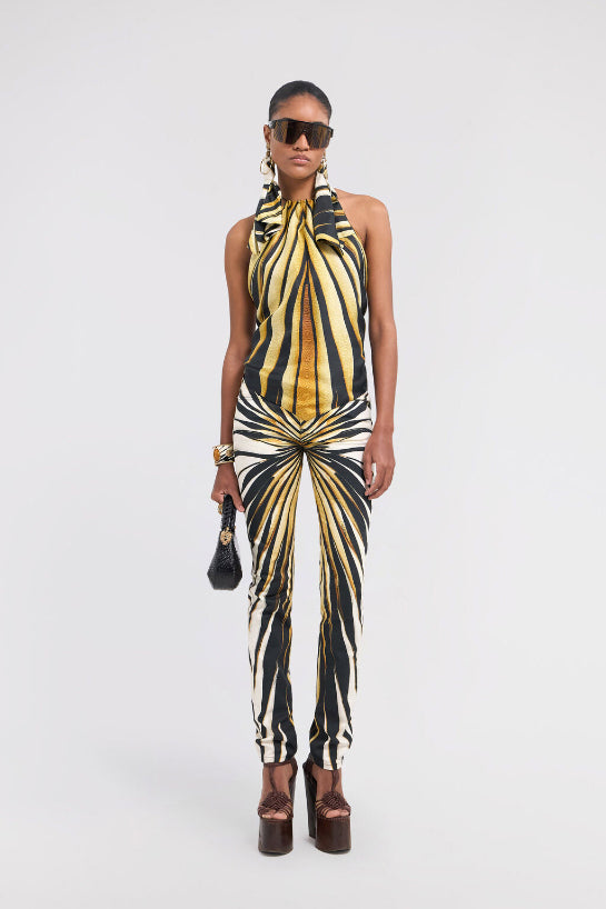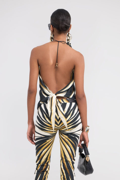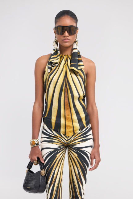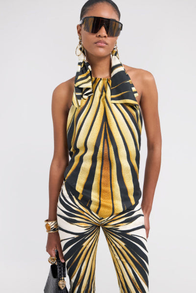 • Embodying vibrant energy, this halter top is adorned with the dynamic Ray of Gold print. Crafted from pure, fluid silk, the design elegantly drapes the figure, featuring slim ties that fasten behind the neck and across the open back, creating a sophisticated and bold silhouette. A piece that captures the essence of Roberto Cavalli glamour, perfect for those who aren't afraid to stand out. The model is 178 cm / 5'10" tall and wears size S / 40 IT.