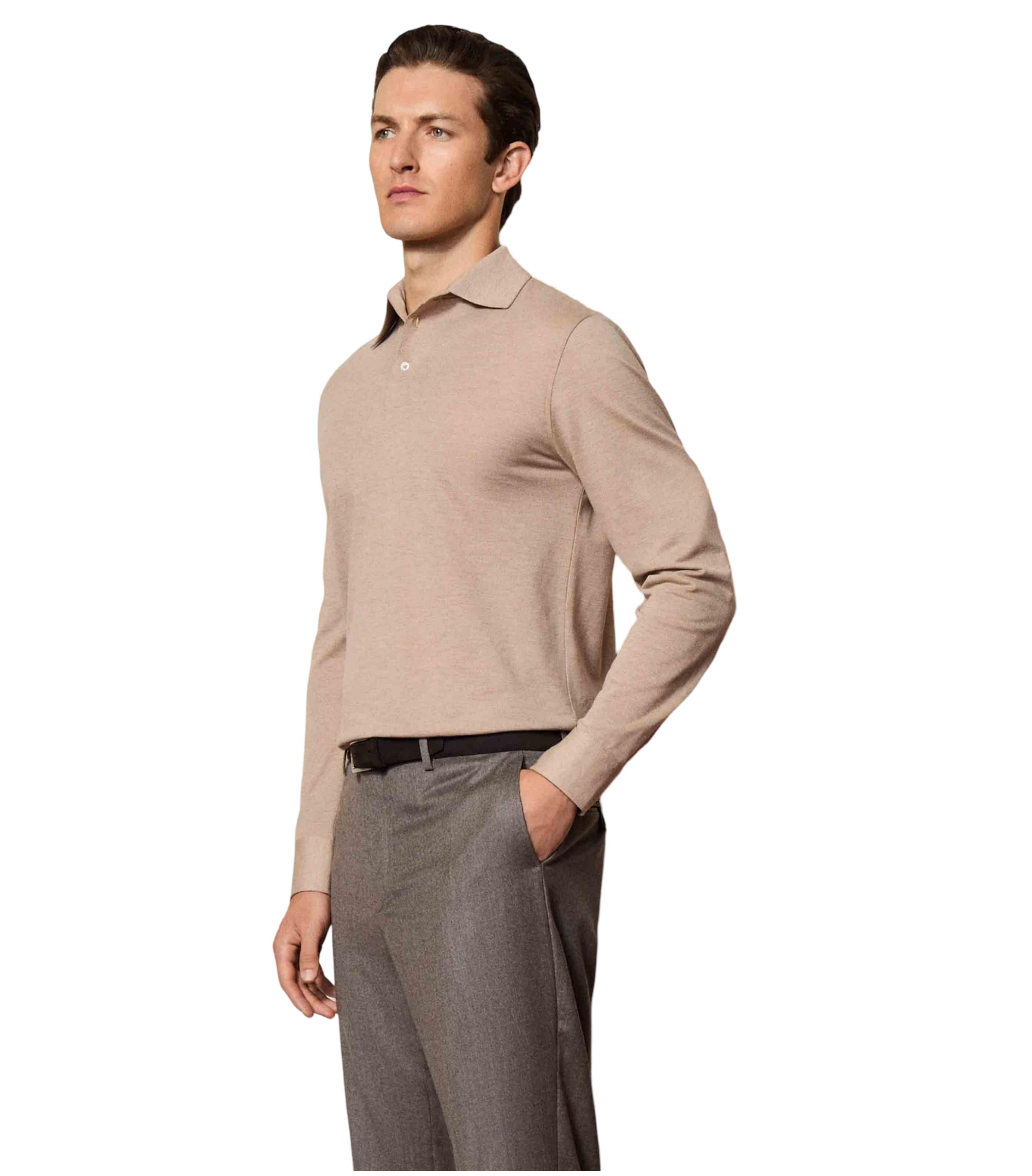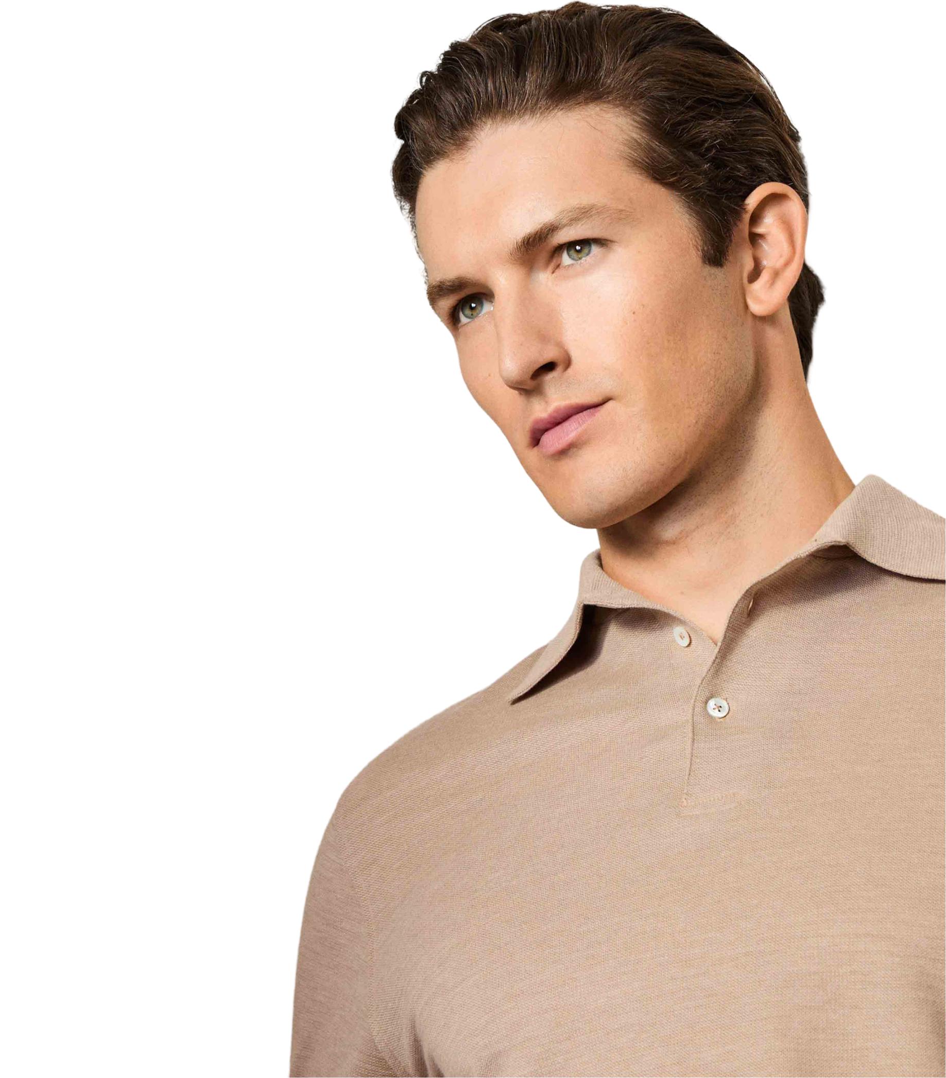 • Long-sleeve polo shirt in a luxurious blend of cotton, silk and cashmere. Elegant one-piece collar. Functional shirt cuffs with mother-of-pearl buttons and slightly rounded edges. Fine contrast trim on the nape and side gusset.