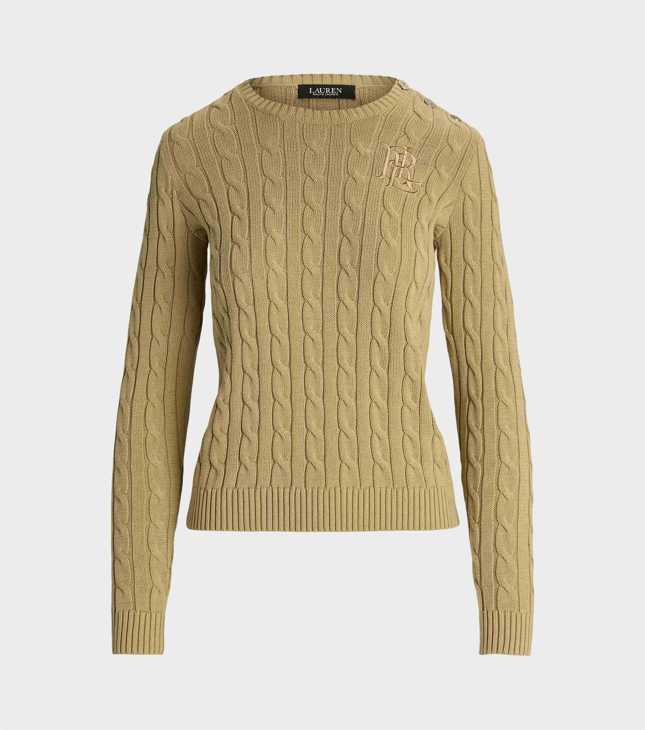 • Lauren Ralph Lauren updates the classic cable-knit jumper with signature button embellishments on the shoulder and an "LRL"-embroidered logo on the chest. Cut for a slim-fitting silhouette, it's knit from combed cotton for a soft hand.