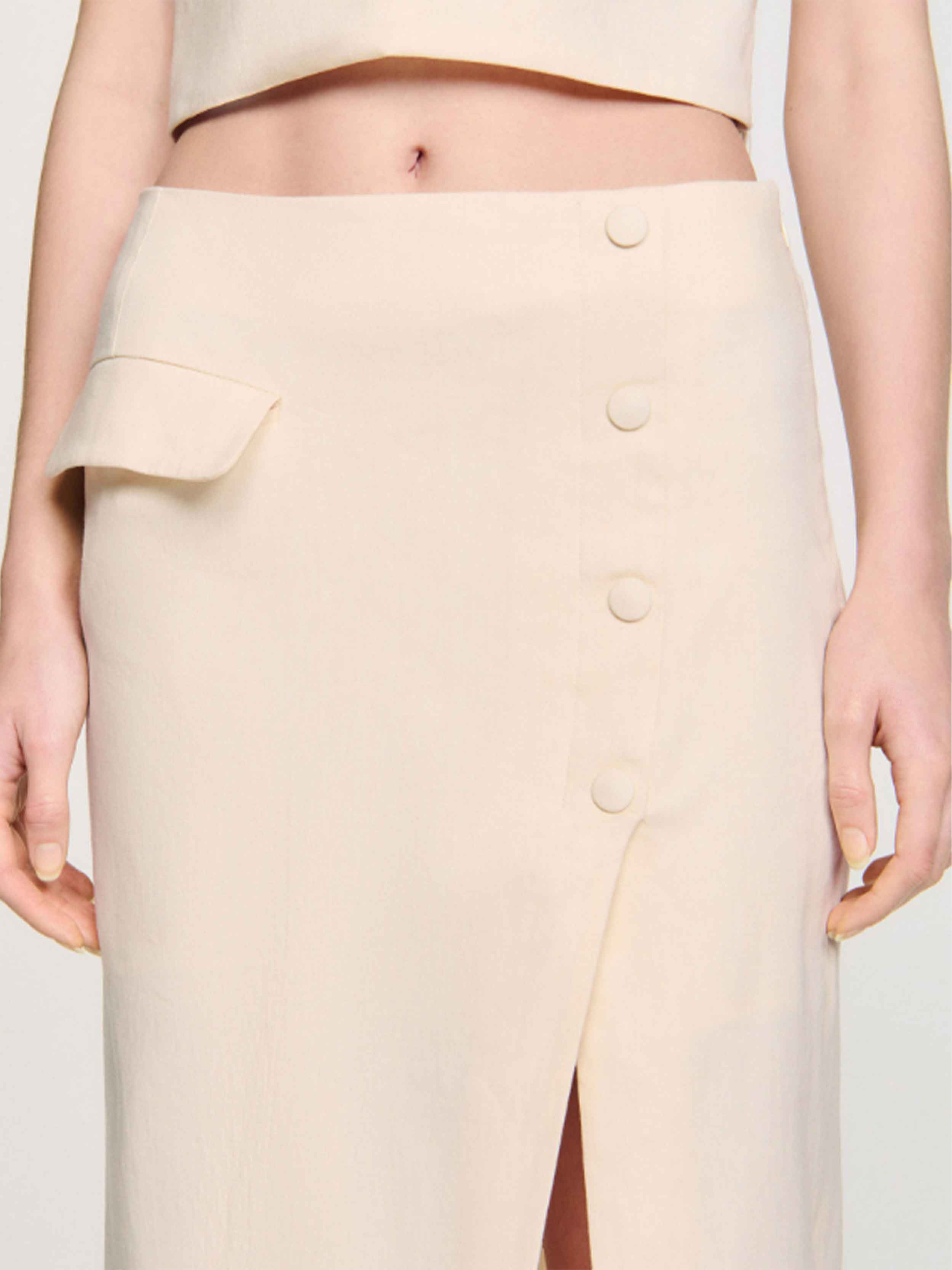 • Long, buttoned skirt with side slit and flap pocket.