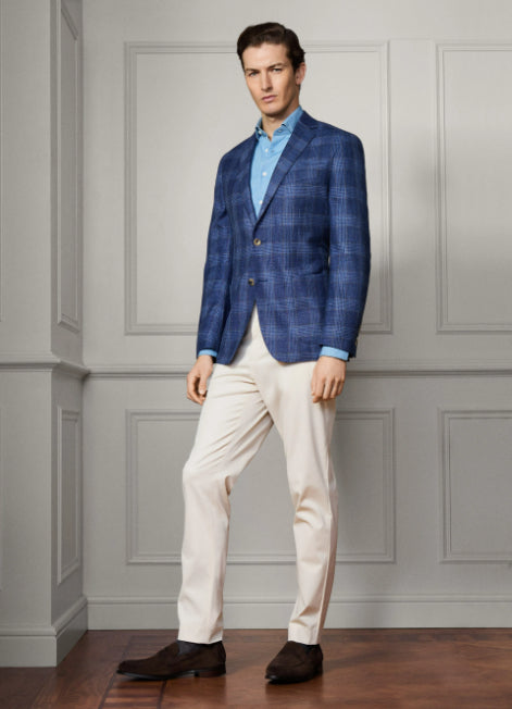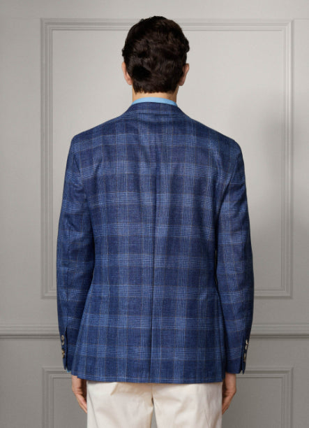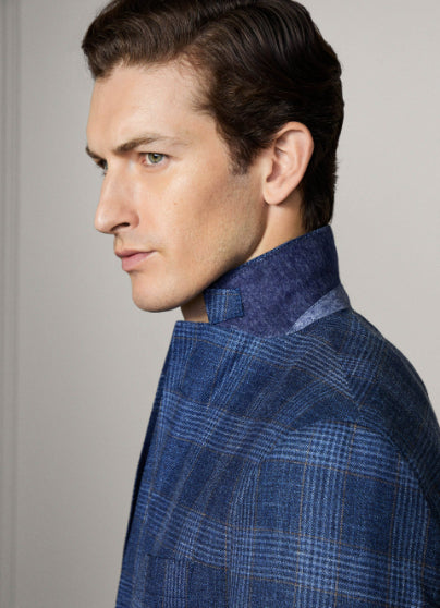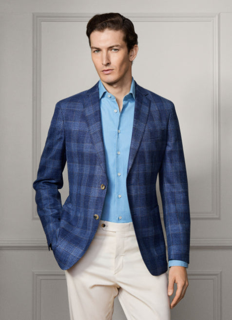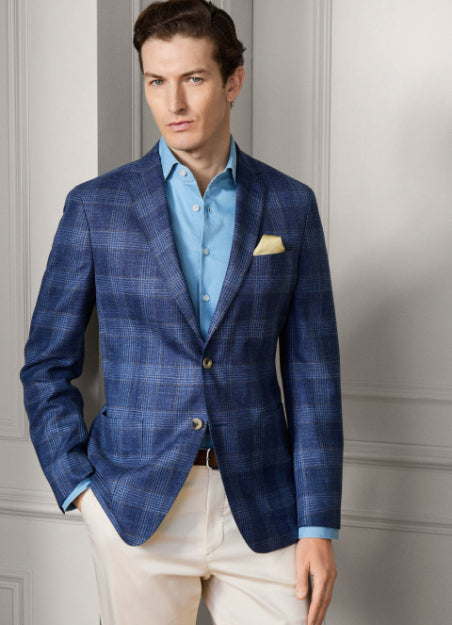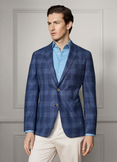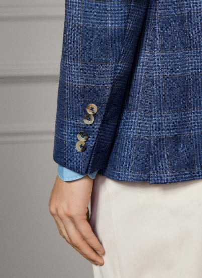 • This jacket in soft denim blue is crafted from a fine Italian wool-linen blend, featuring a bold windowpane pattern with ochre deco detail. It offers a single-breasted notch styling, patch pockets, and signature 2 x 2 working cuffs, finished with signature buttons for a stylish and contemporary look.