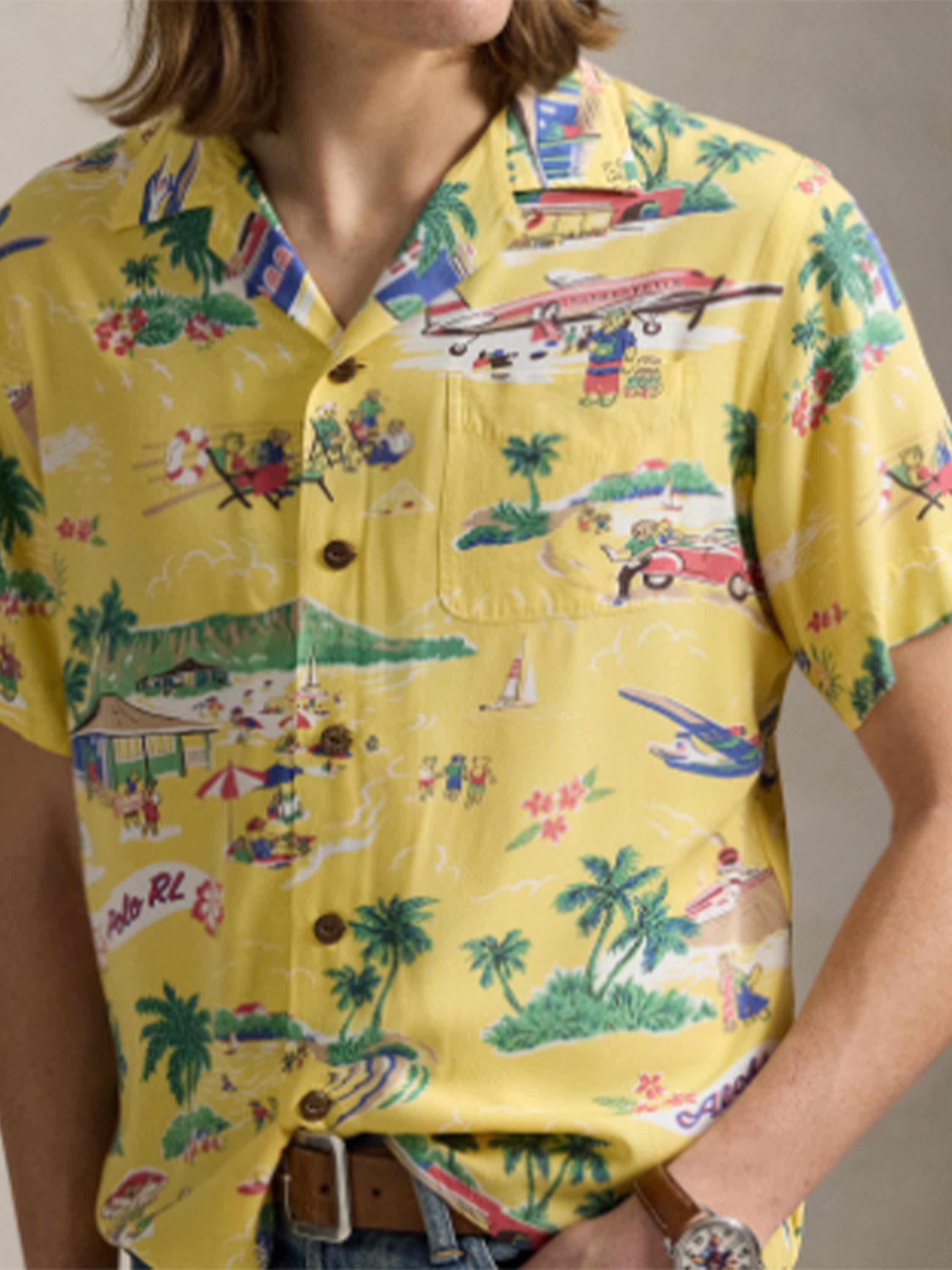 • This lightweight shirt features a retro-inspired motif of our beloved Polo Bear going on holiday. On the front it is finished with coconut-shell buttons.