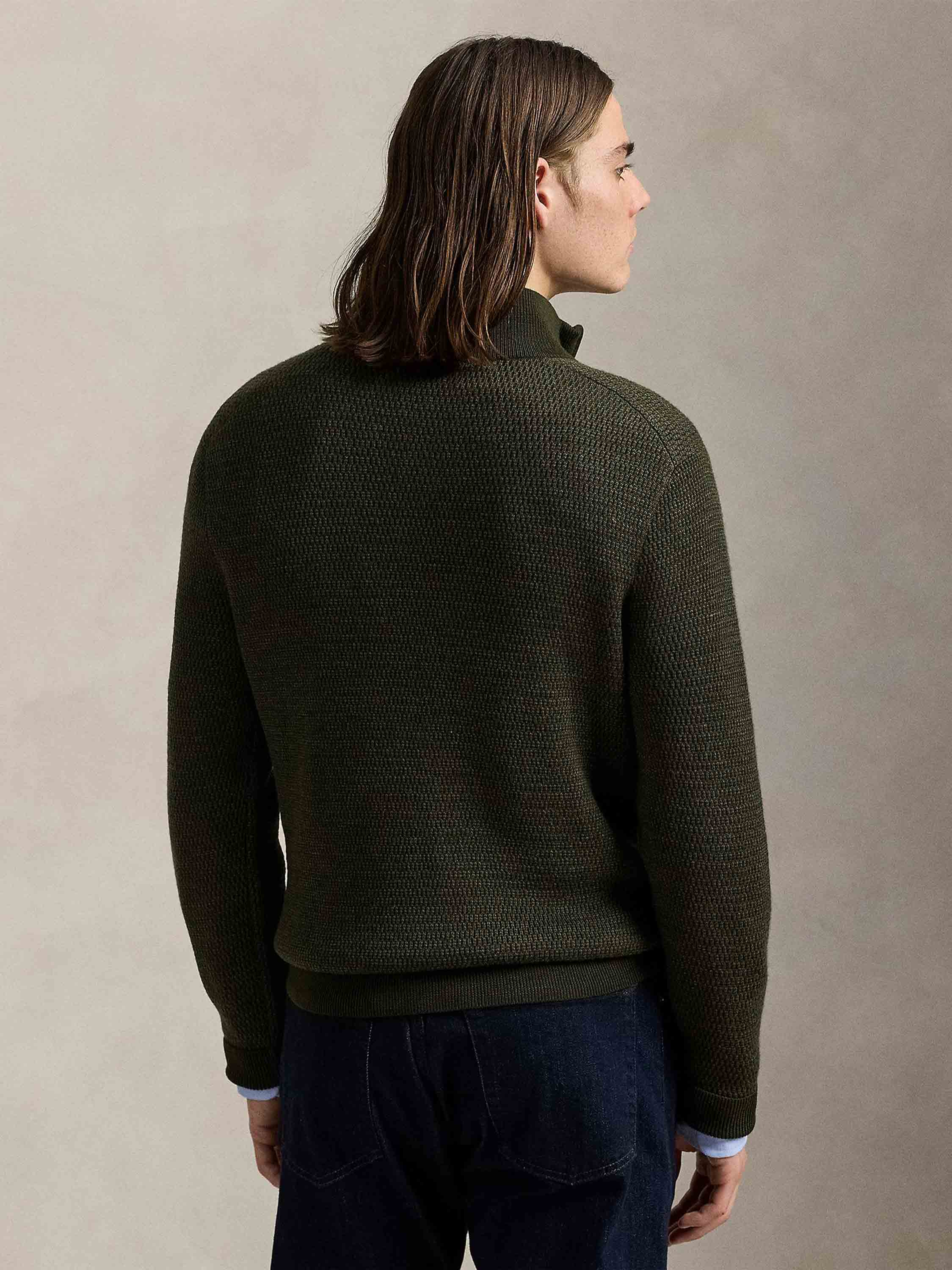 • This mockneck jumper combines fine-gauge worsted wool with a textured-knit construction and our signature embroidered Pony.