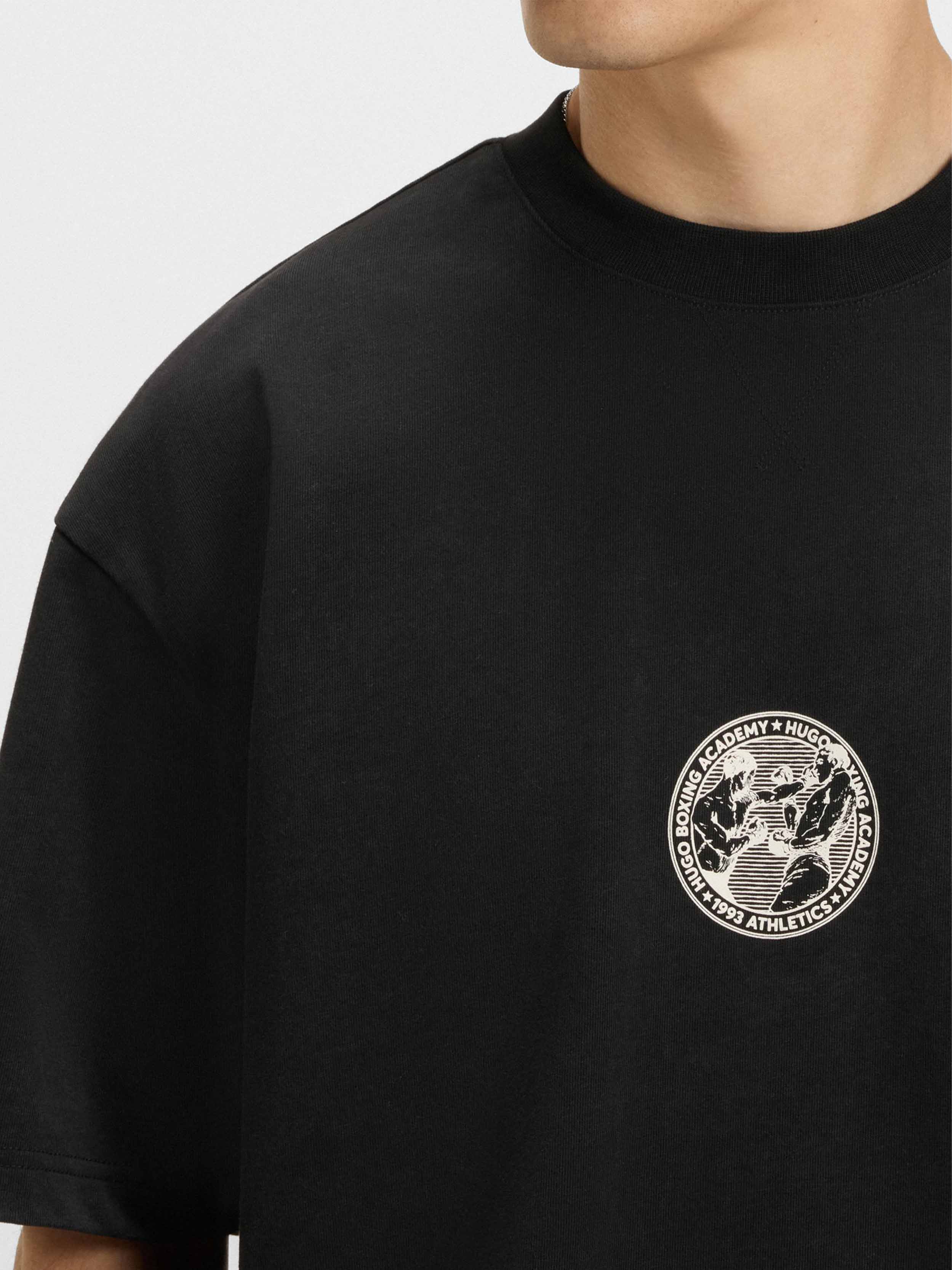 • In a roomy fit, this HUGO Menswear T-shirt is printed front and back with creative artwork inspired by the world of boxing. Soft cotton. This product contains at least 60% better raw materials. This piece is made with at least 60% cotton derived from regenerative agriculture. Regenerative agriculture prioritizes the preservation and restoration of natural environments, aiming to enhance biodiversity, maintain water quality, and improve soil health.