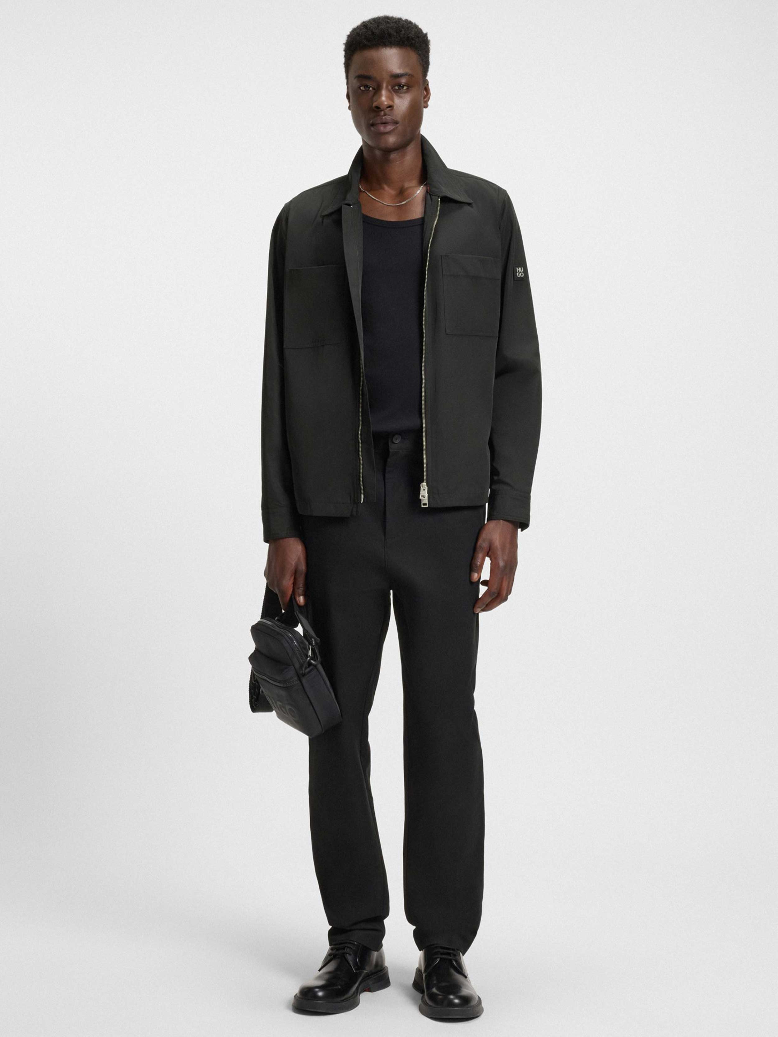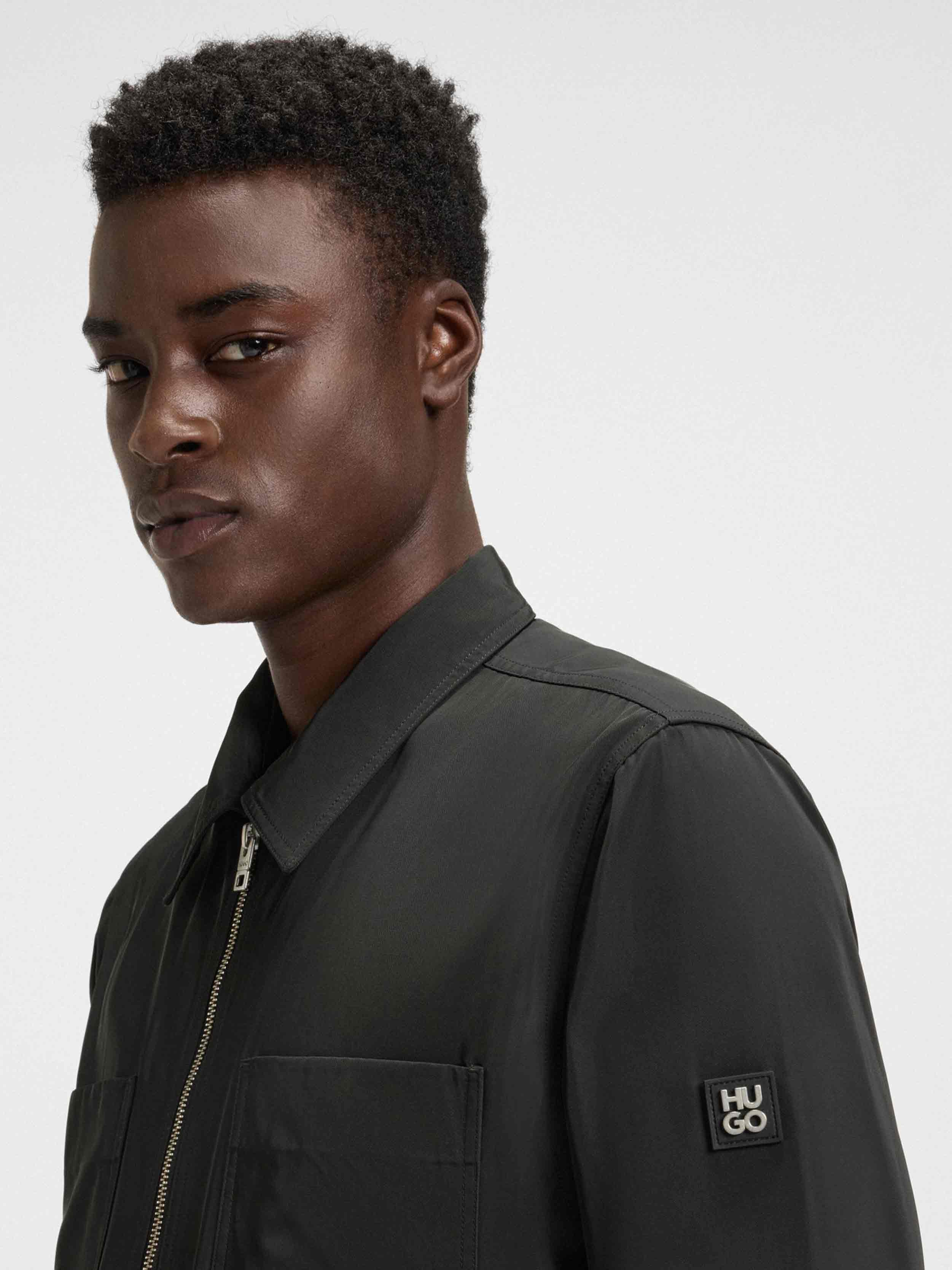 • This water-repellent HUGO Menswear shirt offers protection and contemporary appeal. Laid-back fit. Modern zip-up front. Stacked-logo trim on the sleeve.