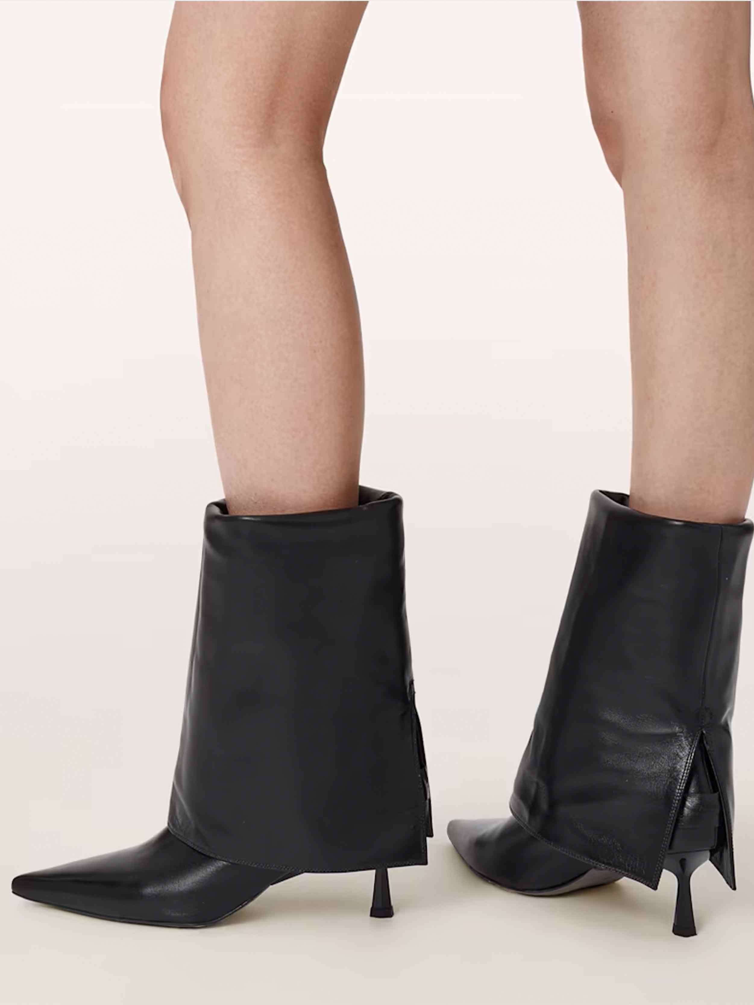 • Talk about versatile… check out the Odyssey Boots. Crafted from leather to a point-toe silhouette, you can wear this heeled pair two ways: knee high or folded over.