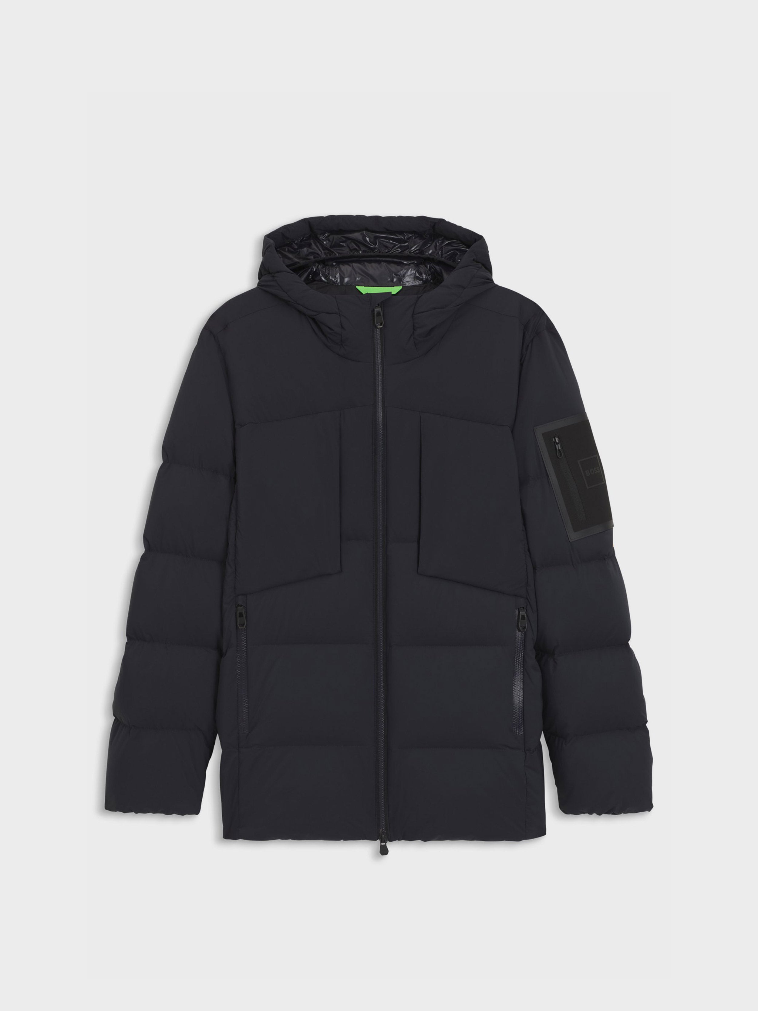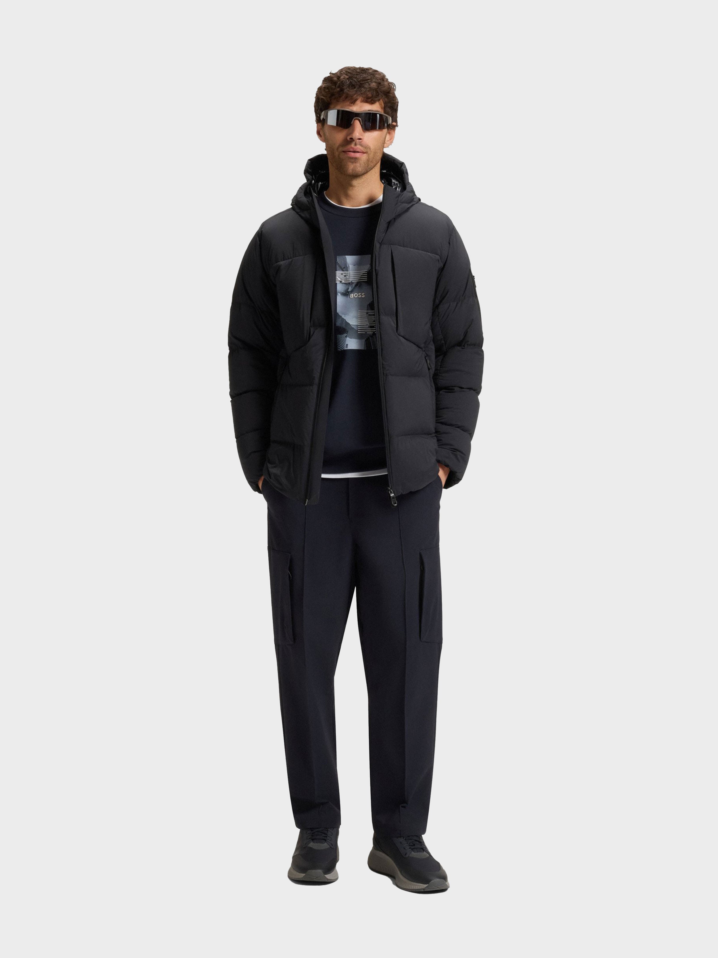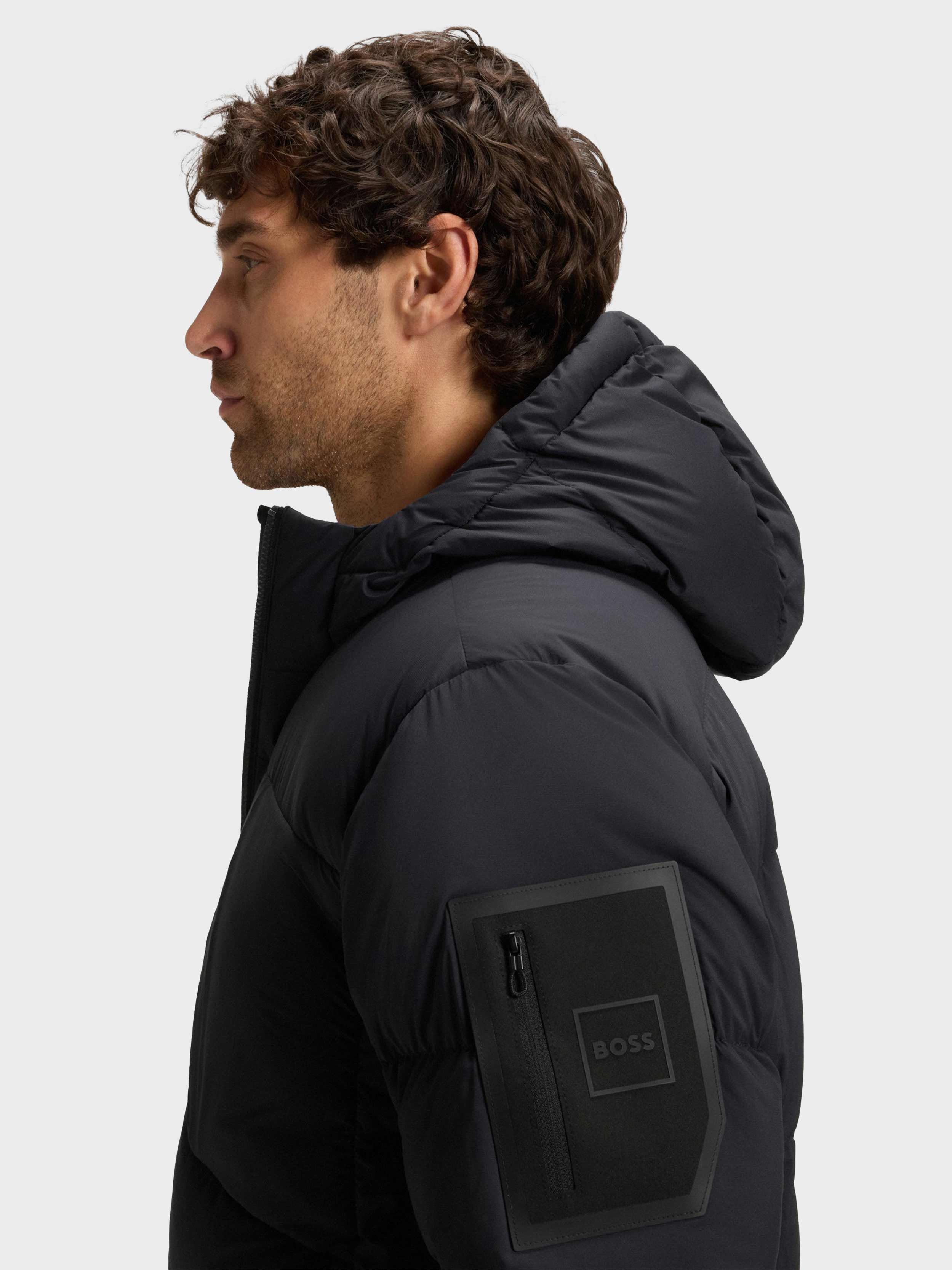 • RIPLITE / jacket / protective high winter down filled (80% duck down + 20% duck feather) / ultra light 4-way stretch quality for high freedom of movement / water-repellent finishing / front closure with comfortable 2- way zip with technical carbon look / front pockets and chest pockets with zip / elasticated cuffs / hood with windshield and elastic binding for protection / inside pocket for extra storage option / BOSS logo print on underplacket / iconic logo zip pocket on left sleeve