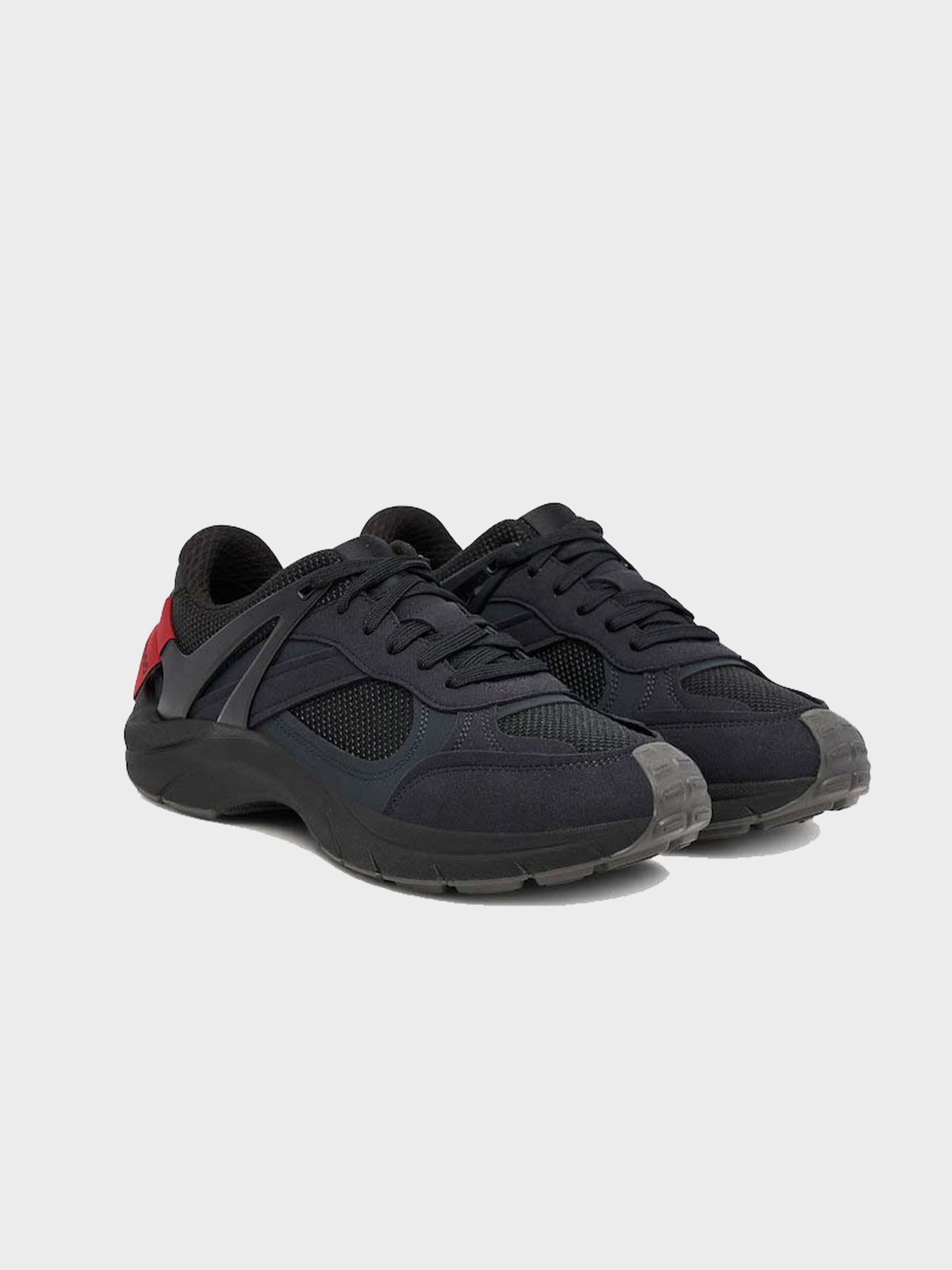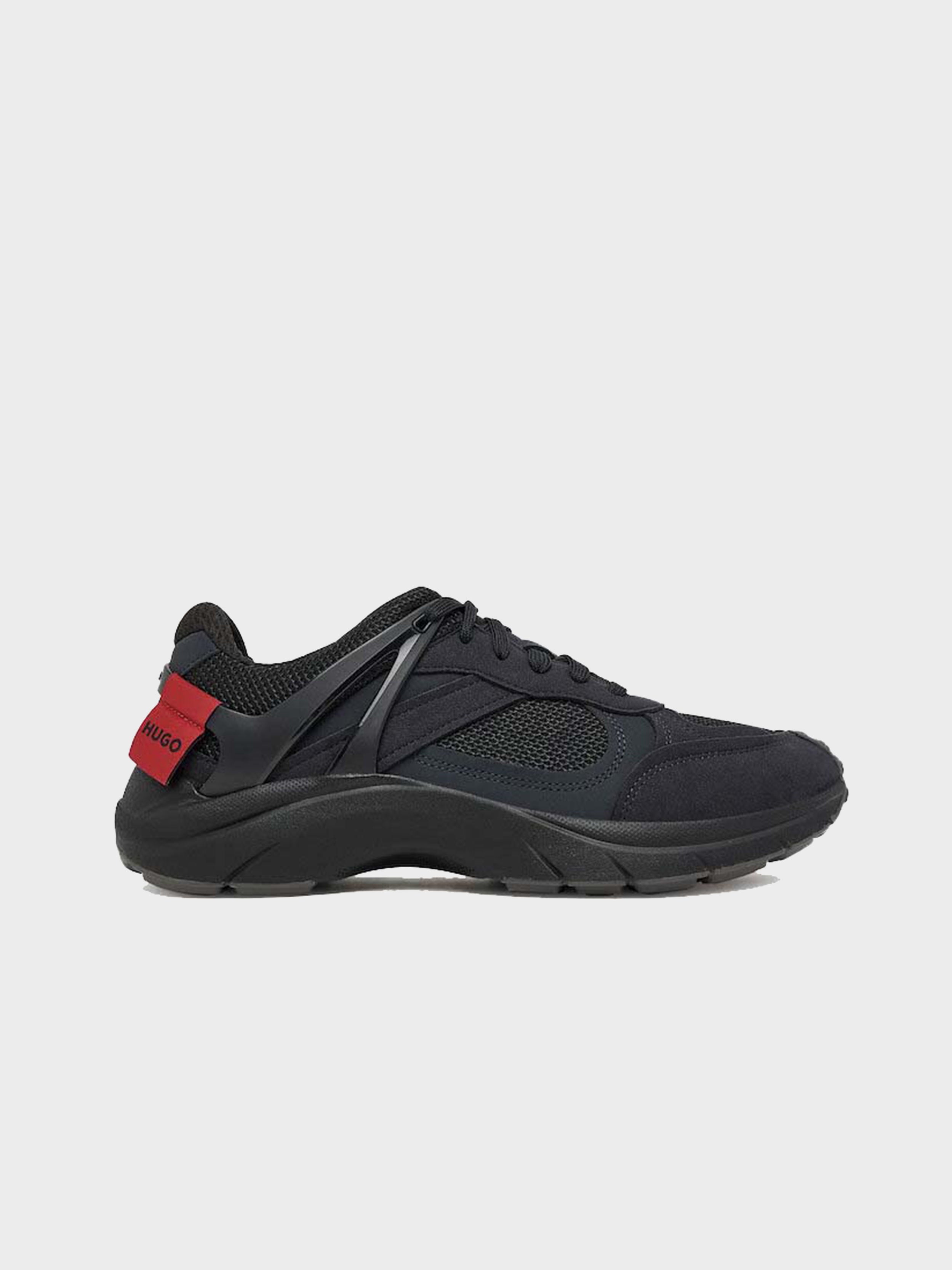 • Featuring a bold spoiler and logo flag, these HUGO Menswear trainers make a strong statement. Mixed uppers in faux suede with mesh and lustrous trims.